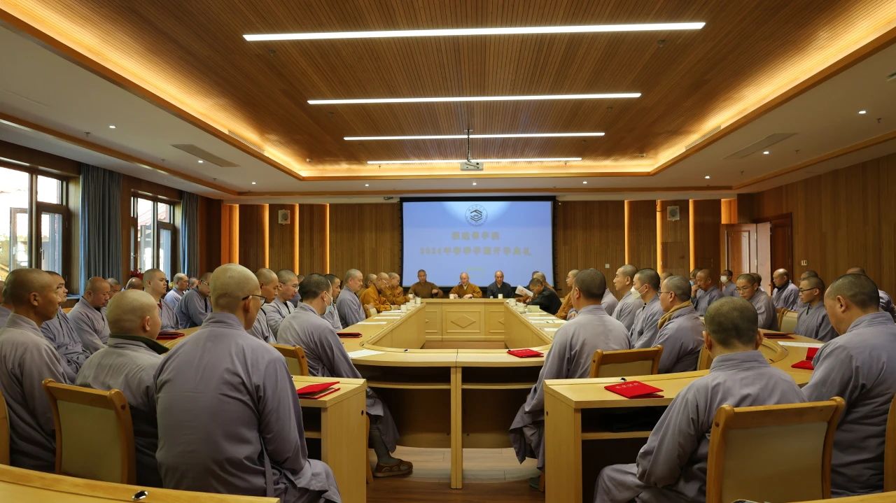 会上,本性法师带领全体师生认真学习《中华人民共和国爱国主义教育法》与中国佛教协会会长演觉法师3月9日在全国政协十四届二次会议第三次全体会议上所作题为《弘扬爱国爱教传统,为中华民族伟大复兴贡献力量》的发言。