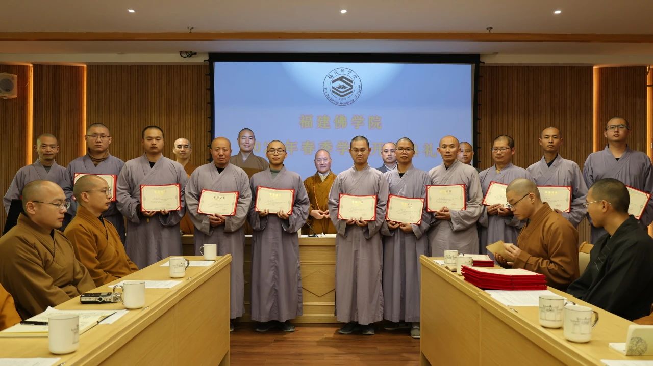 妙演法师宣布转正同学名单,以及2023秋季学期获得全勤奖、综合优秀奖﹑各班前三名名单,由本性法师、寂相法师、印慈法师、无非法师为获奖同学颁发奖状奖励。