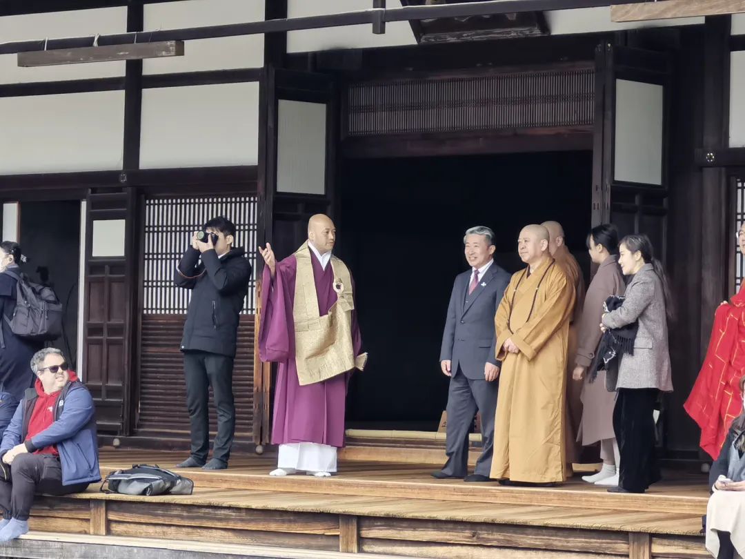 当日的京都建仁寺西来院,梵音缭绕,钟鼓齐鸣。中日两国的佛教界高僧、文化学者及信众欢聚一堂,共同见证这一历史时刻。随着庄严的钟声,参观活动拉开序幕。宗硕法师热情接待了中国佛教代表团一行,详细介绍了建仁寺的深厚历史,结合宣传图片生动讲述了兰溪道隆禅师的心路历程与鲜活故事以及临济宗700余年简要的传承,我国驻大阪总领事馆薛剑总领事陪同参观。
