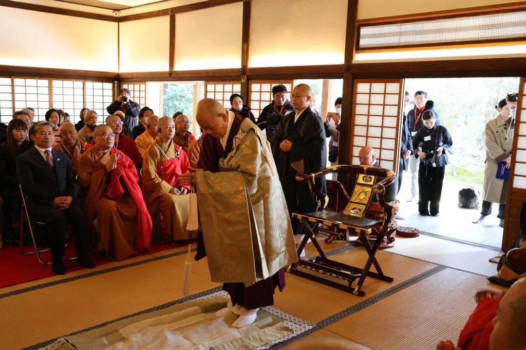建仁寺西来院云林院住持宗硕法师在开光仪式上首先向在场的所有人表示了诚挚的欢迎,并特别感谢了中国佛教代表团纯一团长一行远道而来,参加此次法会。宗硕法师表示,中国佛教代表团纯一团长一行的到来,不仅为法会增添了浓厚的佛教氛围,也进一步加深了两国佛教界的交流与友谊。他深感荣幸能够与中国佛教界的朋友们共同见证这一庄严的时刻。