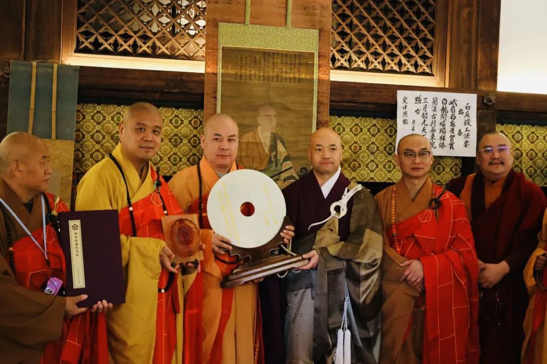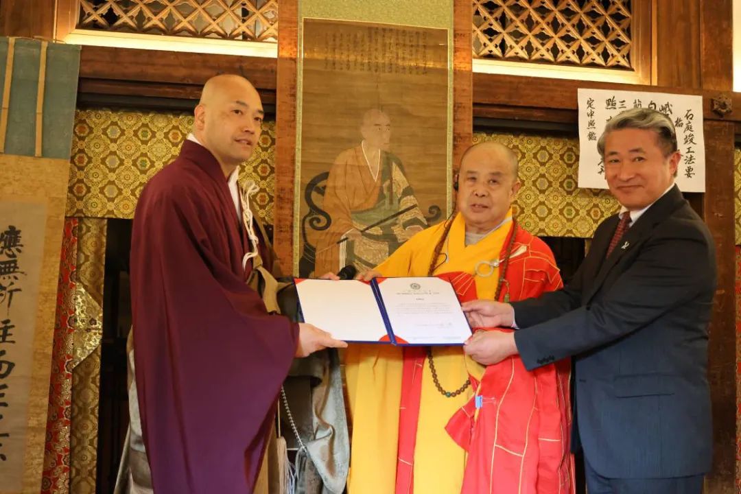 随后,四川成都大慈寺住持大恩法师代表中方向西来院赠送了赠石证明,兰溪道隆禅师家乡的峨眉青石寓意着中日两国佛教界的友谊如磐石般坚固。