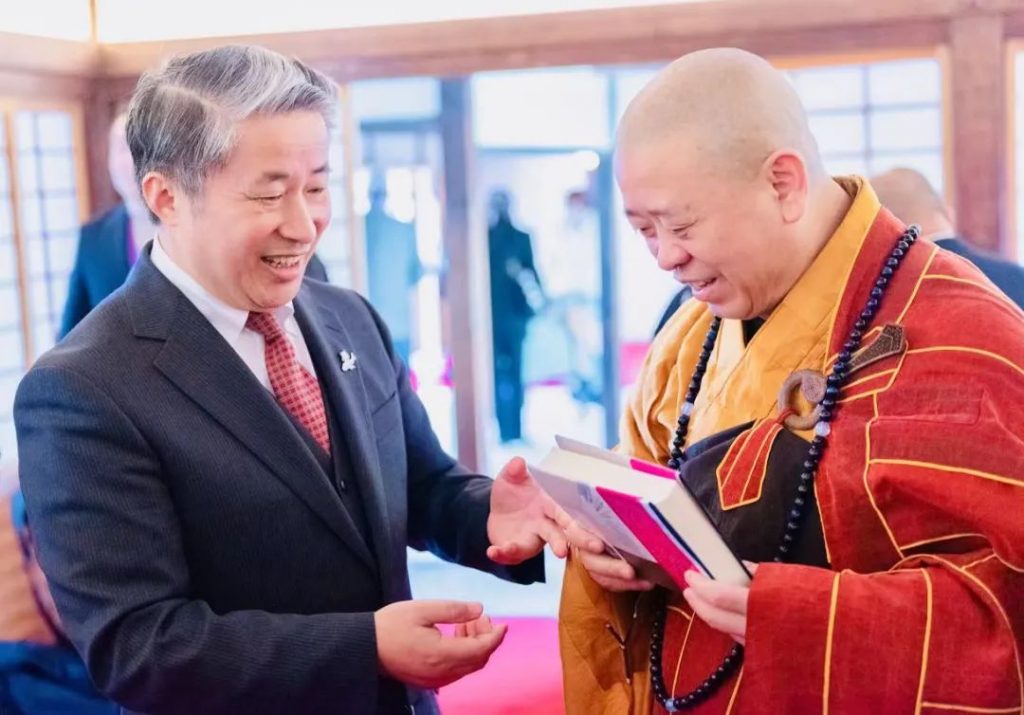 我国驻大阪总领馆薛剑总领事向中国佛教代表团团长纯一法师赠送日文版《兰溪录》