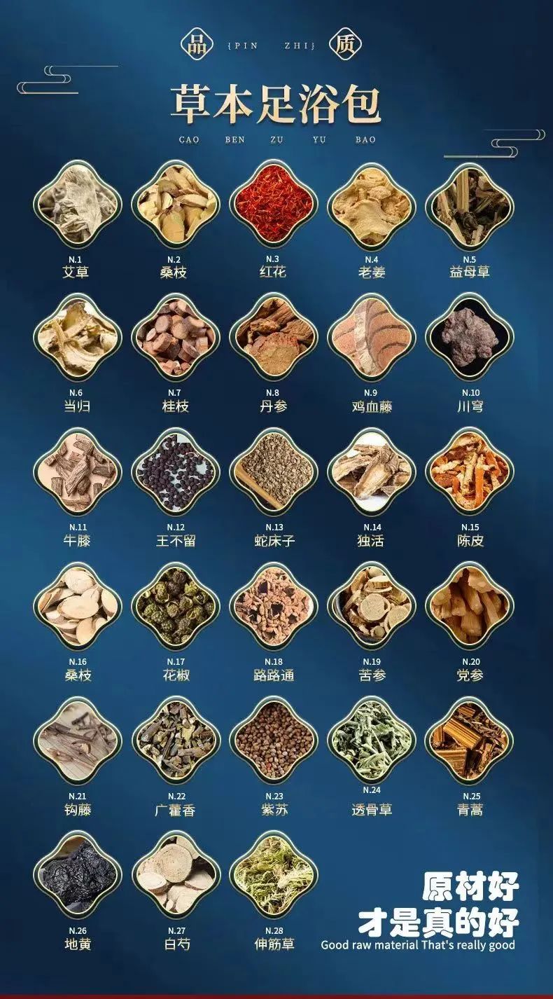 一个小小的足浴包凝聚了艾草、红花、益母草、老姜、陈皮、当归、桂枝、丹参等28种优质草本植物,不添加任何化学添加剂。