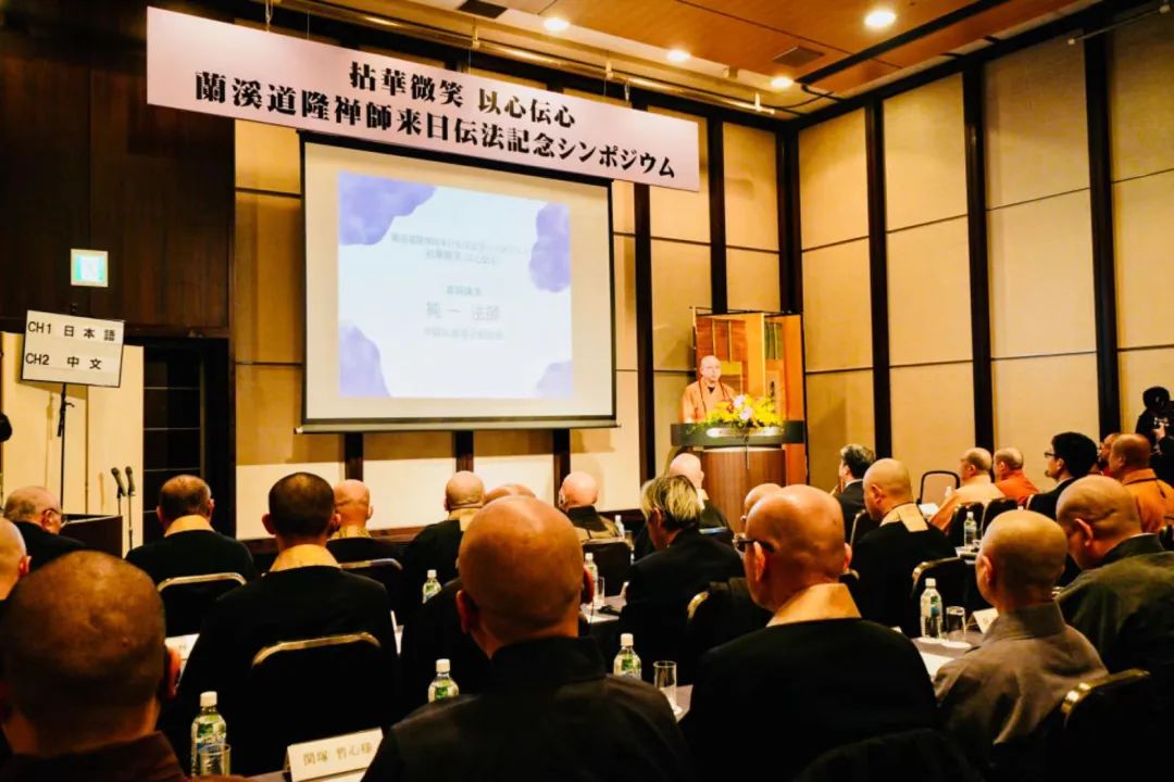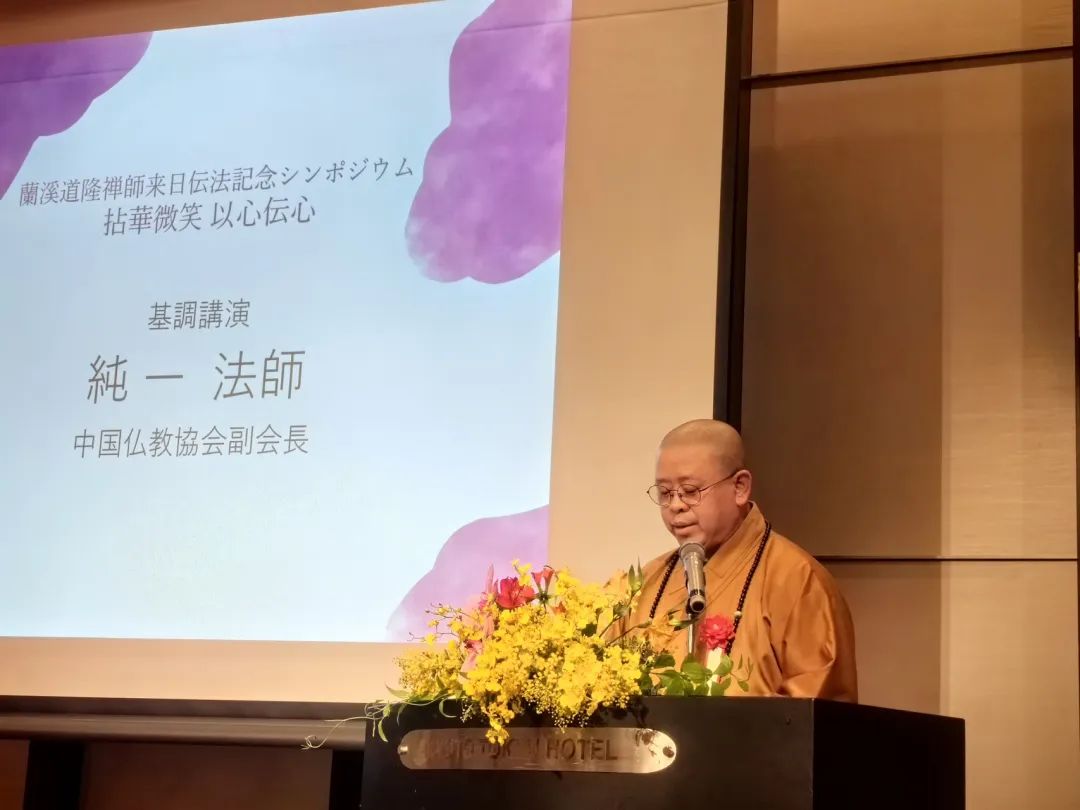 中国佛教代表团团长、中国佛教协会副会长纯一法师法师作了题为《以心传心千载后 万里香花结胜因—— 兰溪道隆禅师与中日禅文化交流”的主旨演讲。纯一法师在主旨发言中,分三大部分对兰溪道隆禅师在日本禅宗发展中的卓越贡献及其禅法思想对后世的影响进行了全面而深入的剖析,引发现场与会人士强烈共鸣。他首先回顾了兰溪道隆的学佛历程,梳理了他的禅学思想来源以及在国内宁波天童寺参学时期与日本来华僧人的交流交往的因缘,特别阐述了兰溪道隆禅师要将中国临济禅法传播到日本的宏远。接着,他进一步把握了兰溪在日本传播临济宗风的主线与足迹,有理有事,充分发掘了兰溪禅师在中日禅文化交流中拓荒性的重要作用。
