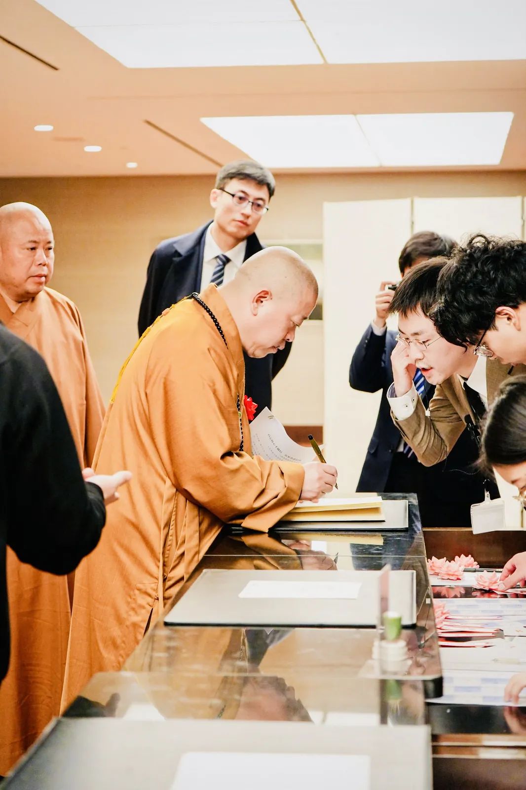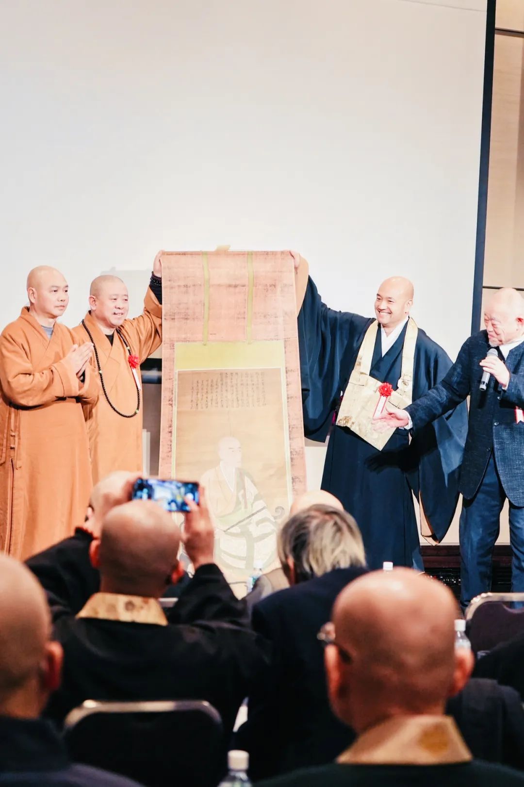 云林院宗硕法师和日本修复文物古籍的知名匠人大入百太郎大师现场向中国佛教协会代表团代表赠送了400多年前保存至今的“兰溪道隆禅师画像”的精密高仿复制品,由纯一团长和来自兰溪禅师家乡的重庆市佛教协会副会长、法雨寺住持正智法师代为接收,双方再续前缘,在交流中共话历史,期许未来,祈愿携手同心为中日友好交流贡献智慧和力量。