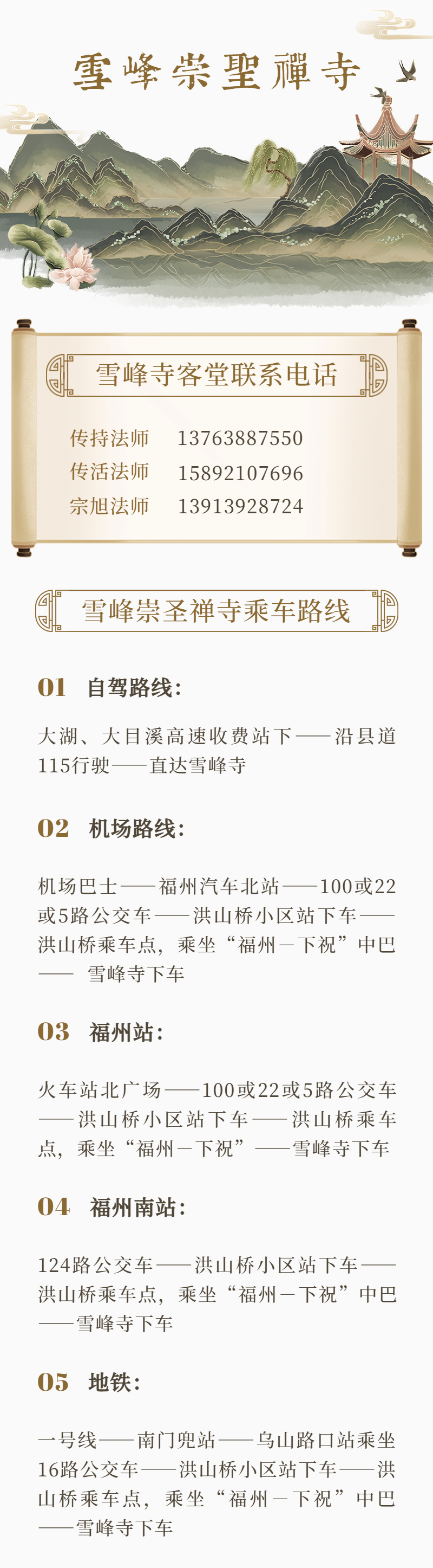 “福州-下祝”中巴车,最后一班15:30从洪山桥乘车点出发。洪山桥乘车点有便车到雪峰寺,时间一般在18:00以前,如果错过了中巴车,可以尝试搭乘便车,车价40元。(包车最少230元)