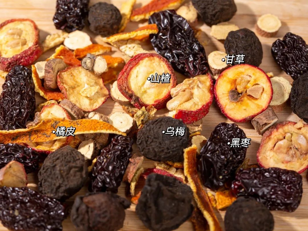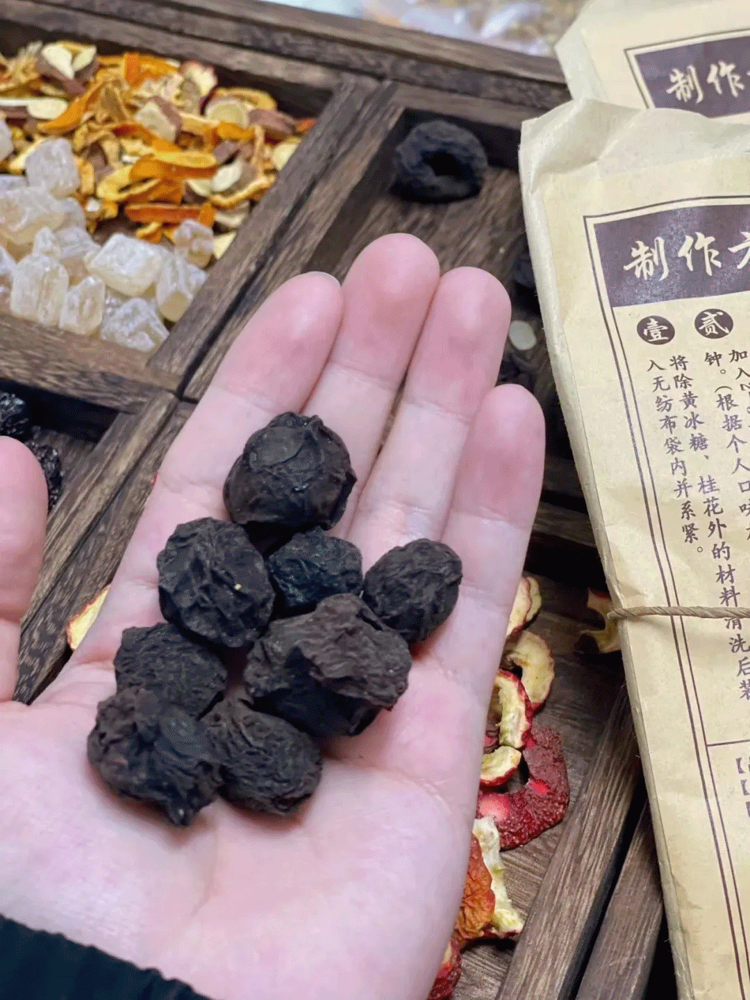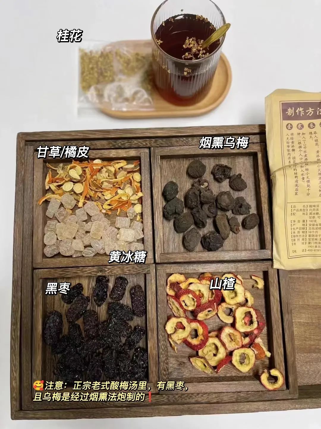 这是因为里面放的乌梅,采用了传统的烟熏法炮制,而正宗老式酸梅汤里的乌梅就是烟熏的!乌梅性酸,“酸味入肝胆”能除心烦、降燥热。