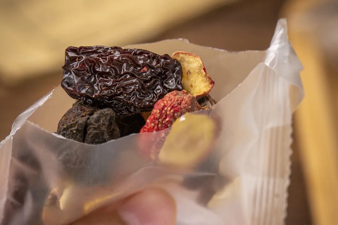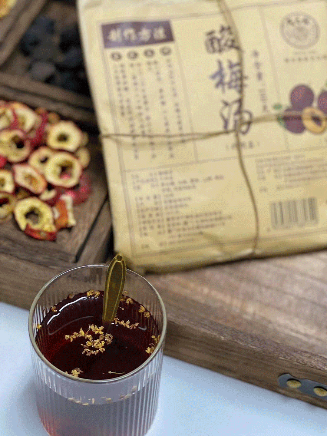 所以,宝芝林酸梅汤的配料,用黑枣代替洛神花,再加乌梅、甘草、山楂、橘皮,全都是新鲜大果制干,比例经过多次调整,高度复刻老式酸梅汤的味道!