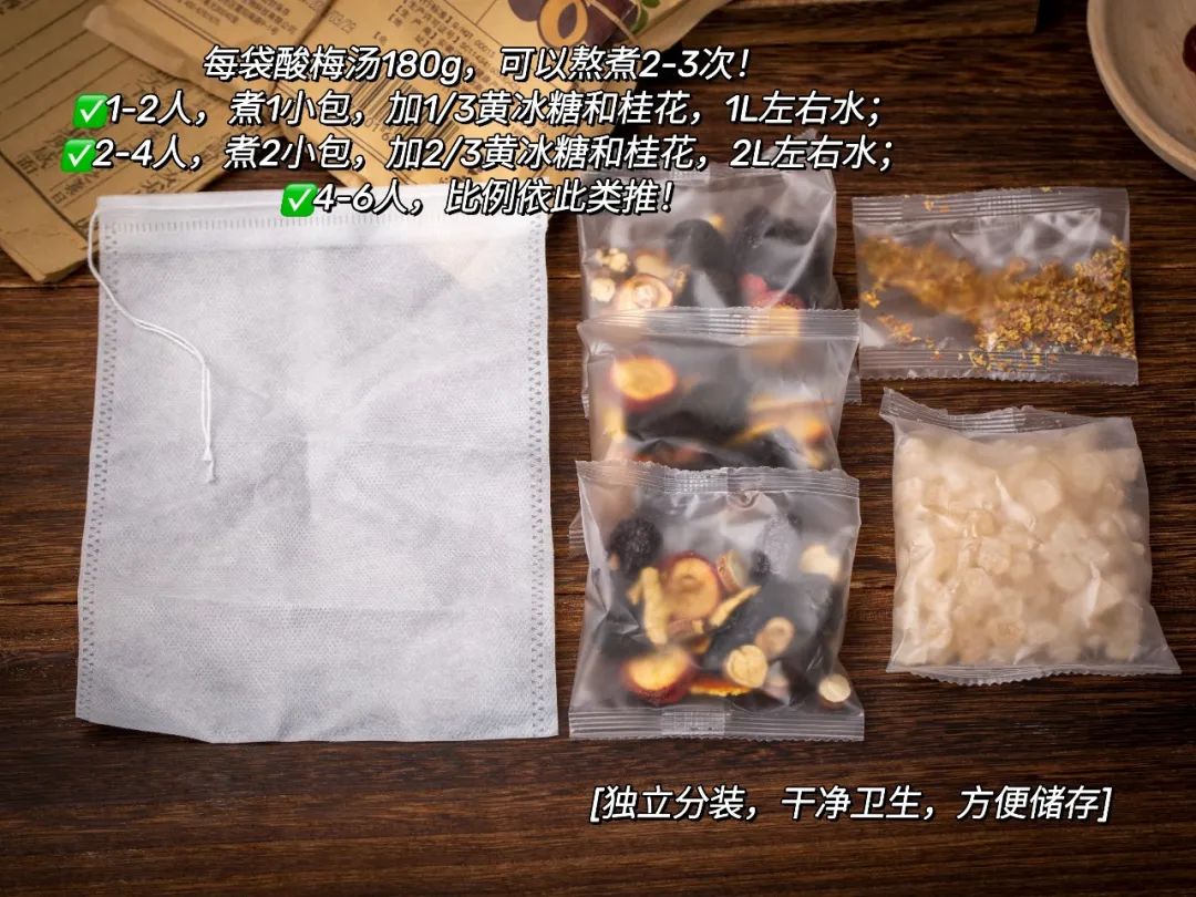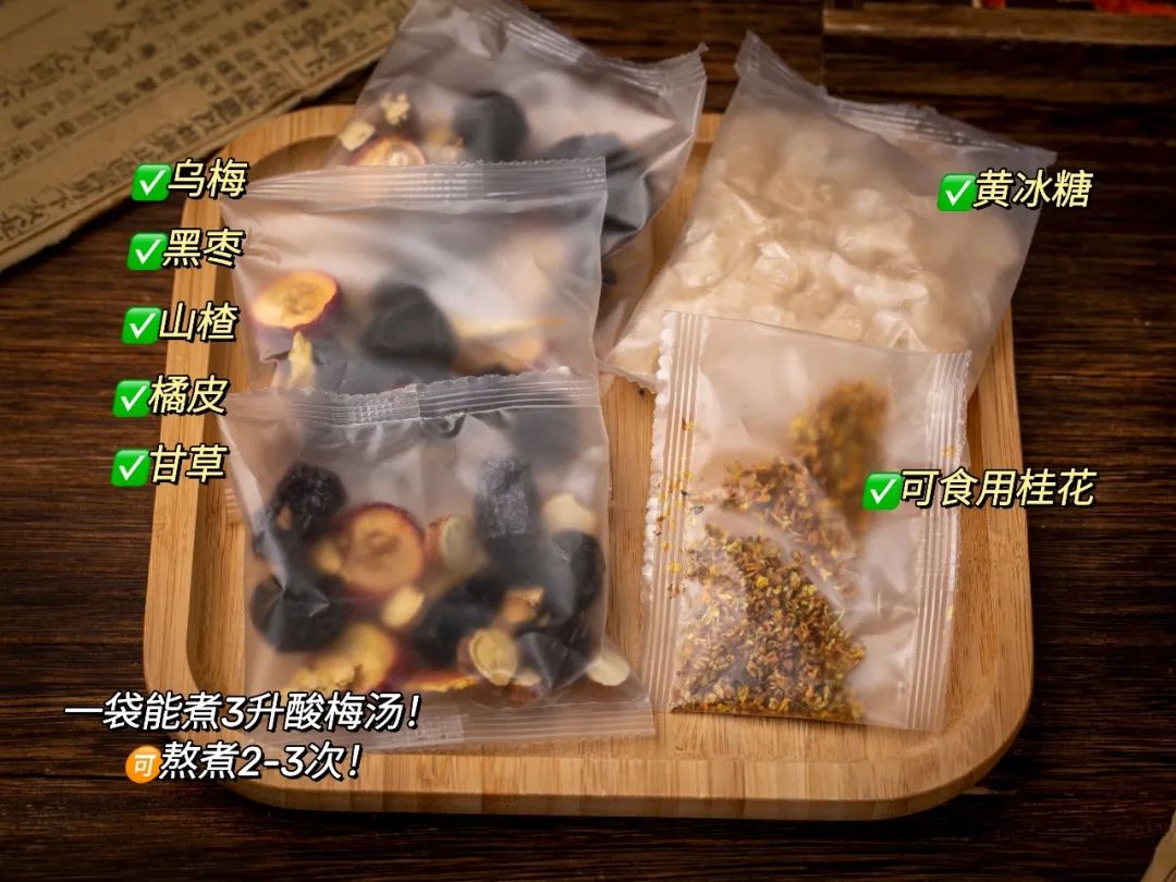 每袋酸梅汤,都有乌梅、黑枣、橘皮、山楂、甘草、桂花、黄冰糖7种配料,科学配比,不掺假不造假,也没有任何防腐剂、色素添加剂,一眼看过去就知道有多真材实料!