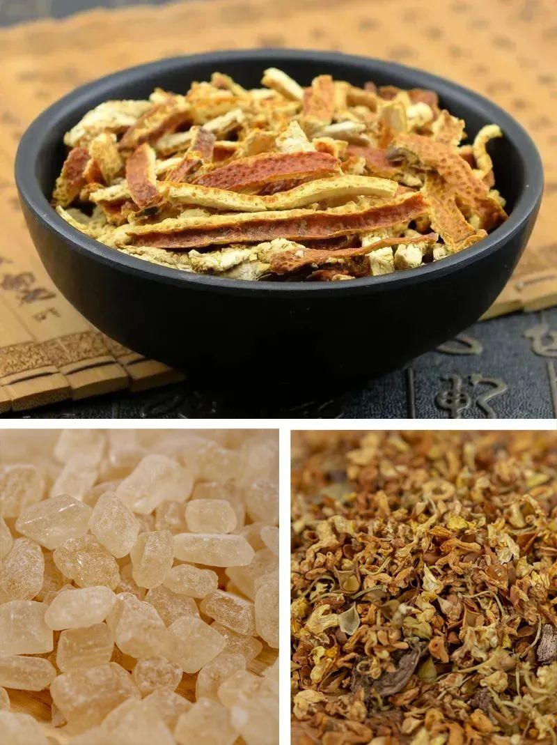 另外还有橘皮、黄冰糖和桂花。橘皮无需多说,是开胃酸梅汤里必不可少的一味!黄冰糖来自云南,古法工艺熬制,比白冰糖甜度、营养成分都要高很多;再加入桂花,简直是酸梅汤的点睛之笔,沁人心脾的清新香气,让人心情都变好了!