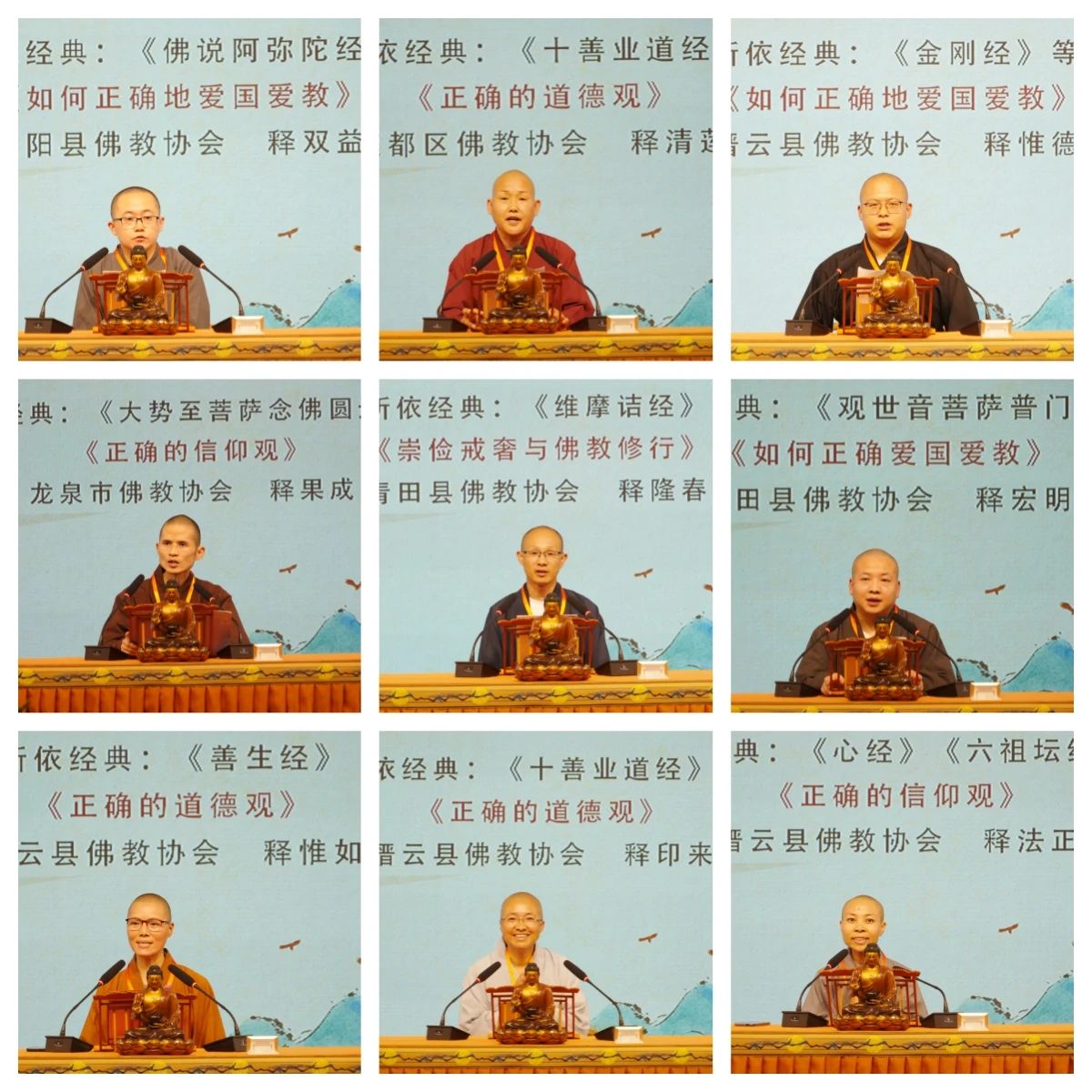 在讲经交流环节,由丽水市各县(市区)佛协推荐的9位青年法师依次登台演讲。法师们依照《金刚经》《心经》《阿弥陀经》《十善业道经》《普门品》等经典,结合个人修学所得,紧扣社会主义核心价值观,围绕“如何正确地爱国爱教”、“正确的信仰观”、“正确的道德观”、“崇俭戒奢与佛教修行”等主题,契理契机地对佛教经典教义进行阐释。