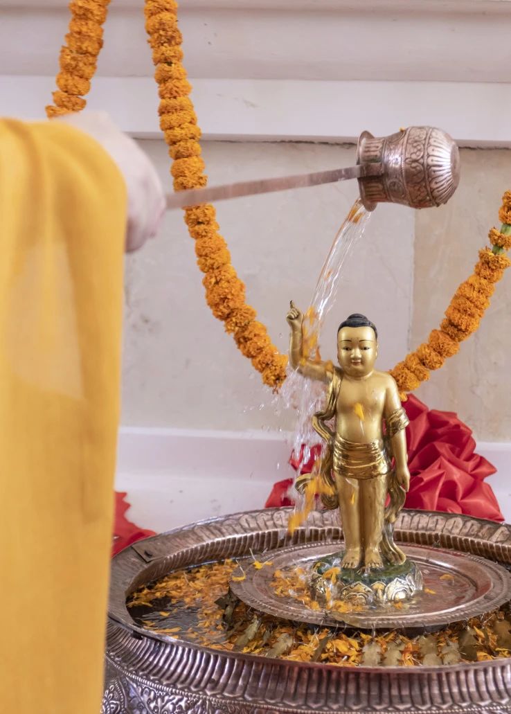 佛经记载佛陀诞生之時,有九龙各喷香泉,为太子沐浴,后人为了纪念他出生之时就确定了成佛的身份,所以每当他的诞生日,就模拟九龙吐水为他沐浴,以表示接受佛法,护持佛法。
