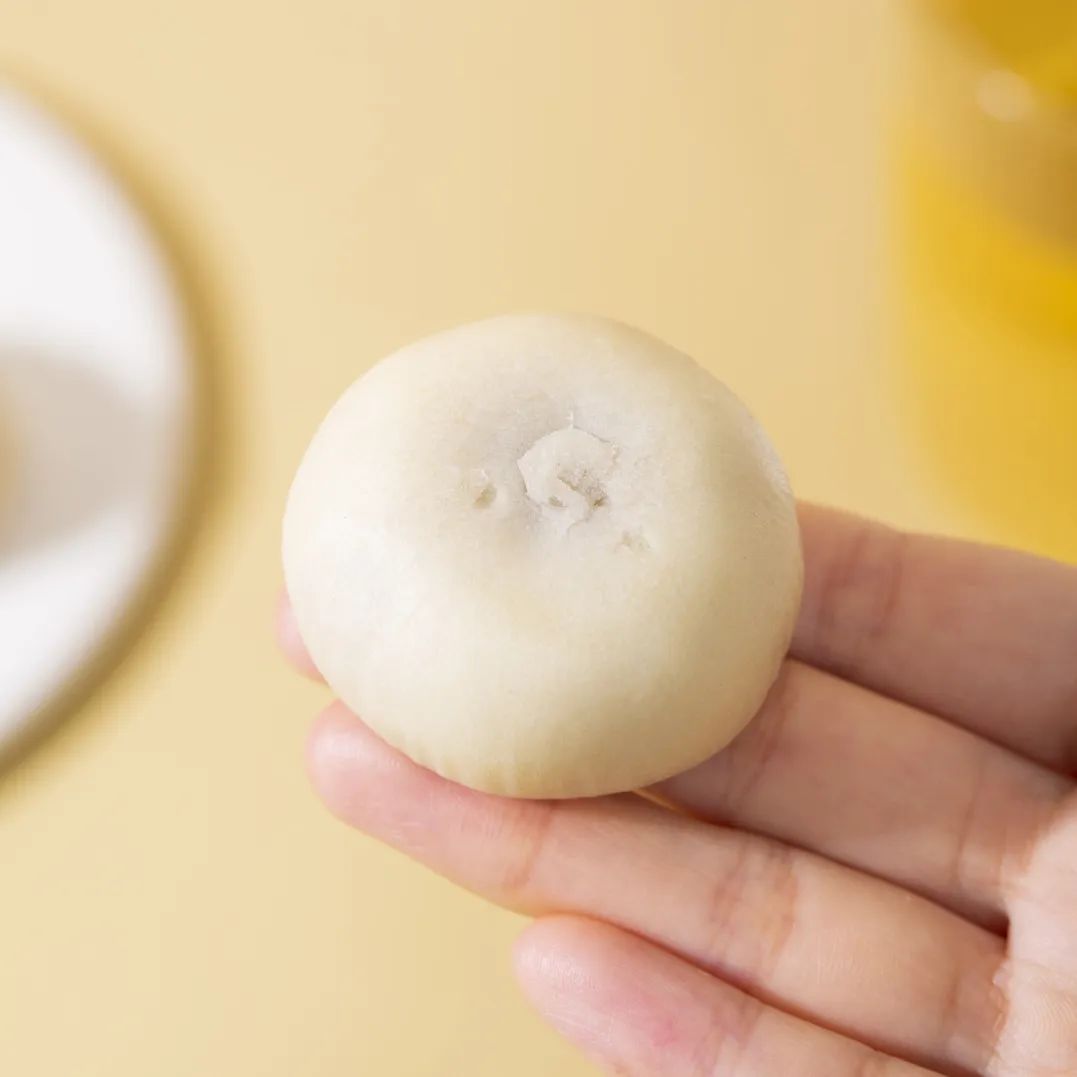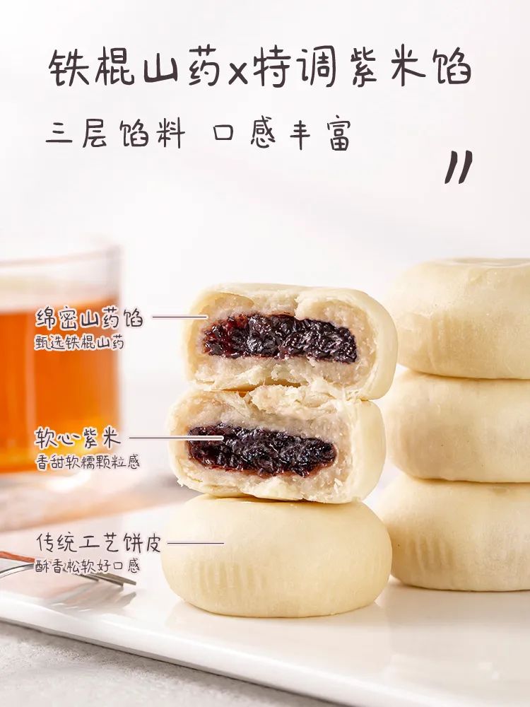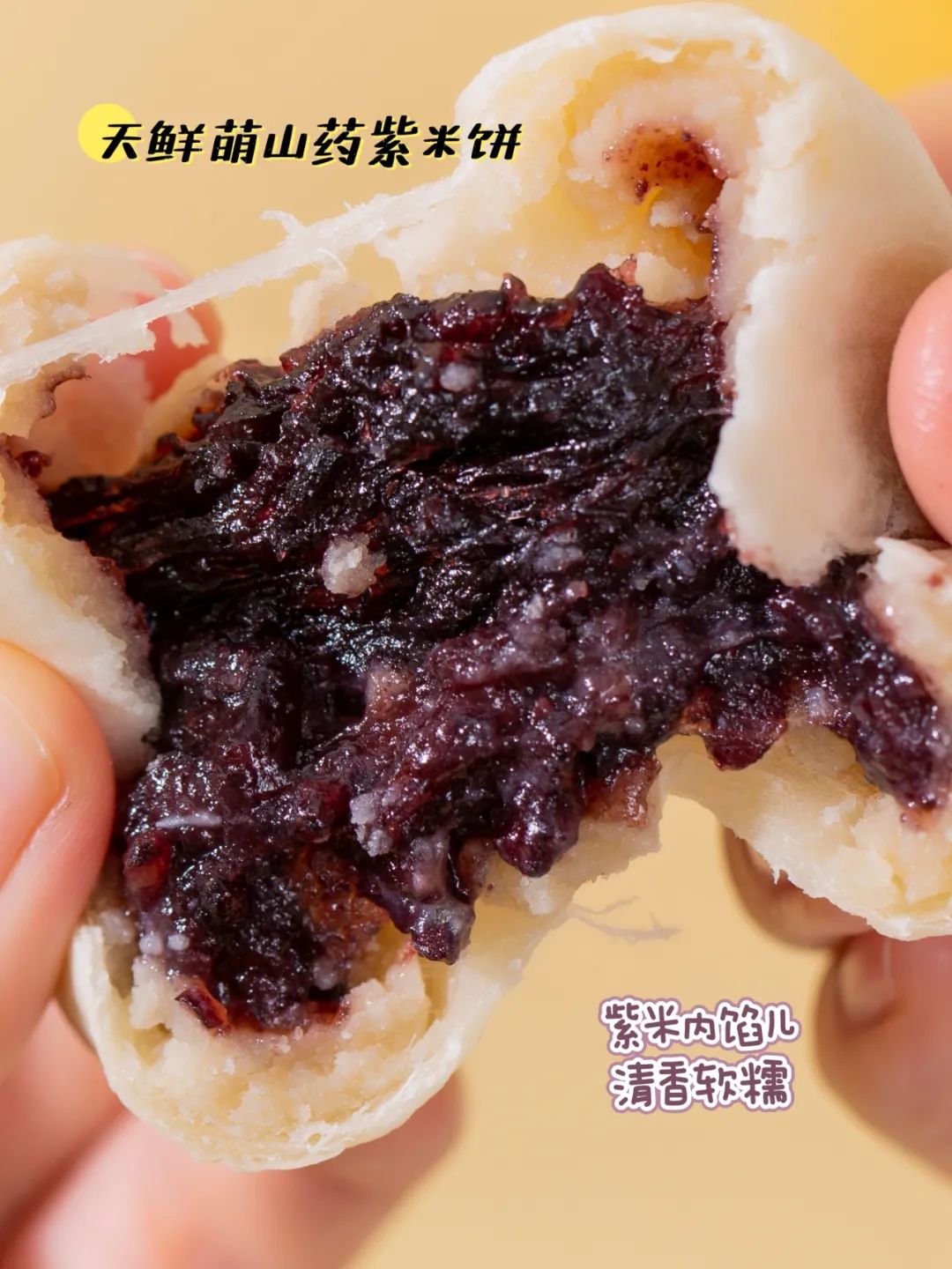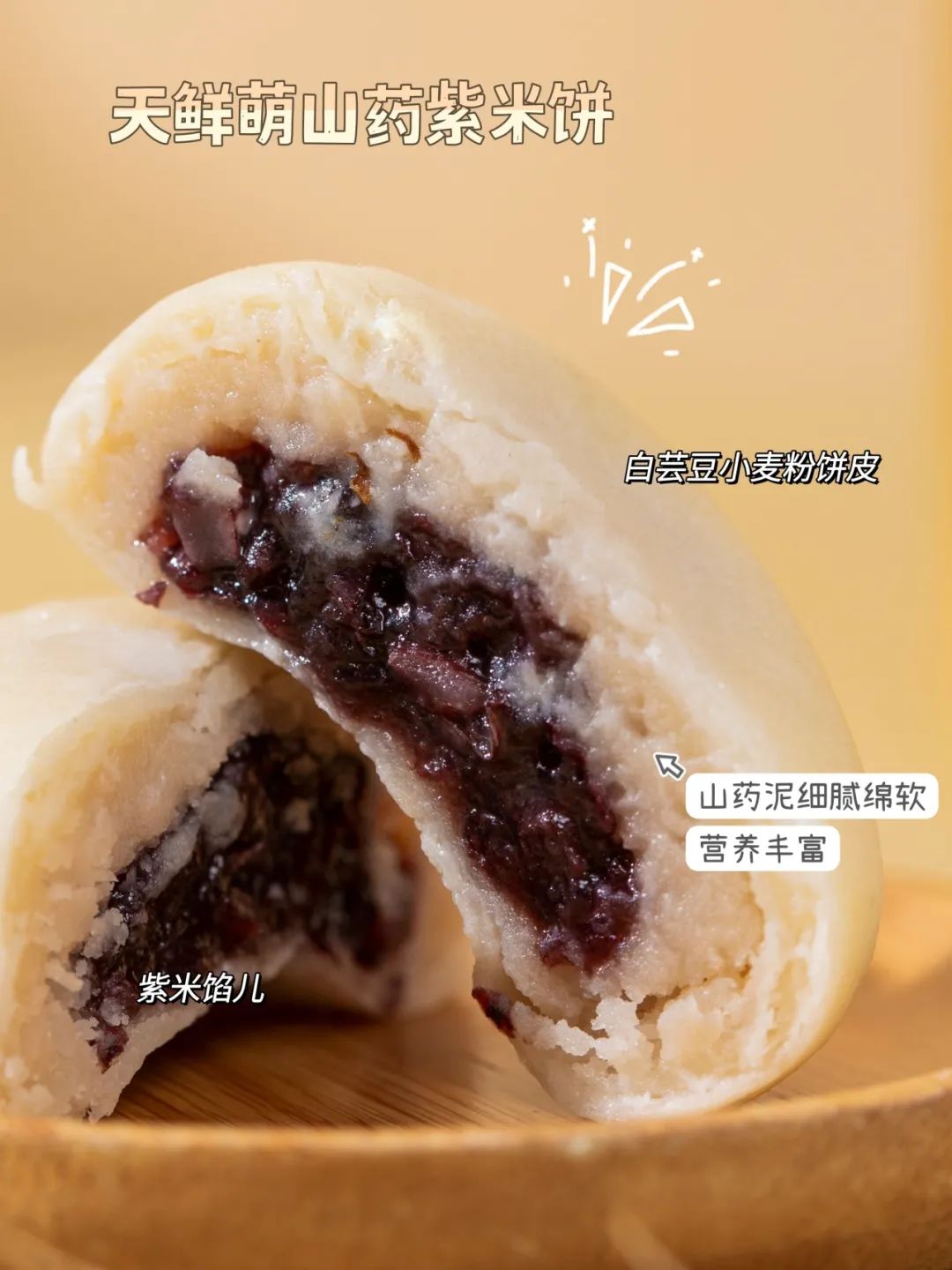 和其他零食小饼不同的是,天鲜萌用的是白芸豆、小麦粉做饼皮,内馅是绵密口感的铁棍山药泥和软糯紫米!三层不同食材,层次感一下就出来了!