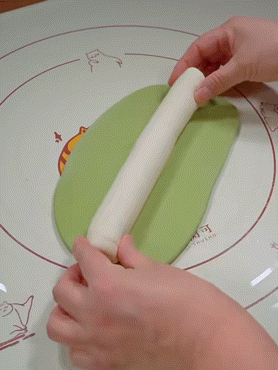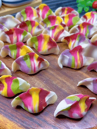 混色饺子五彩粉面团擀成片,白面团搓成棍状,用彩色片包裹并继续搓成棍状,然后按照普通饺子包就ok啦~