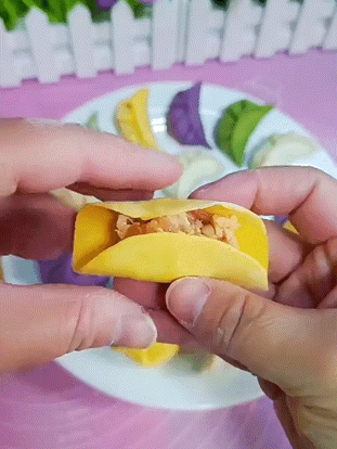 五彩饺子将饺子皮对折,中间捏一下,
