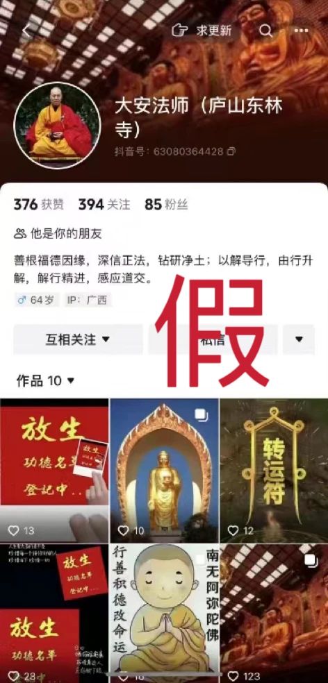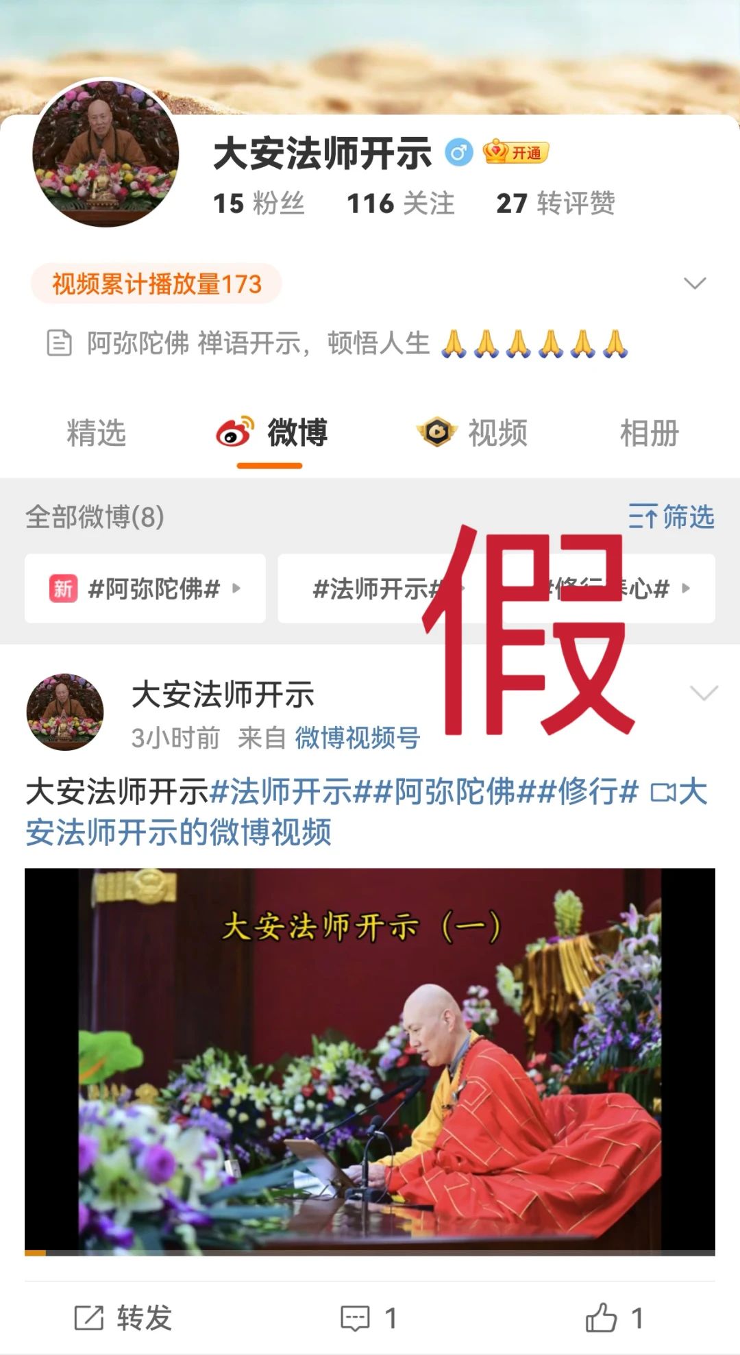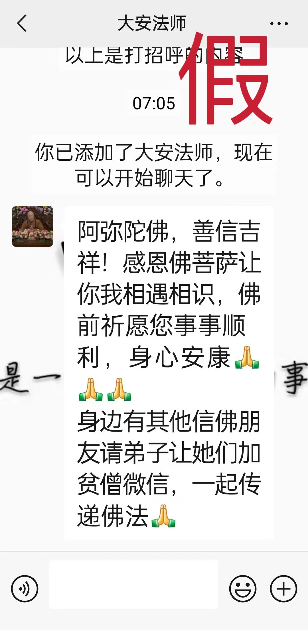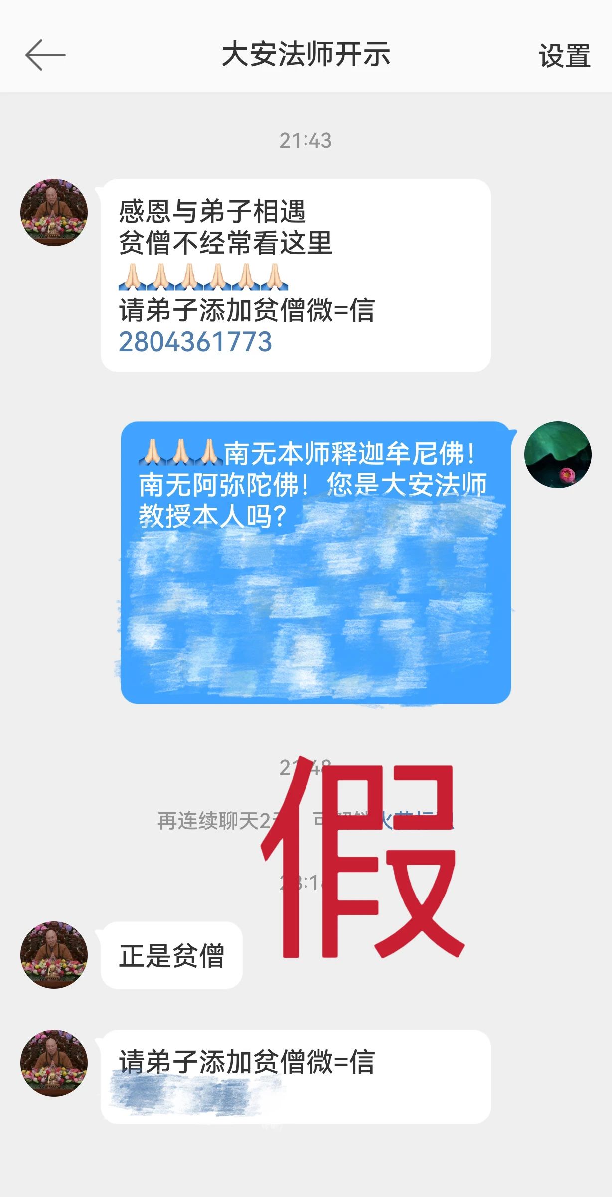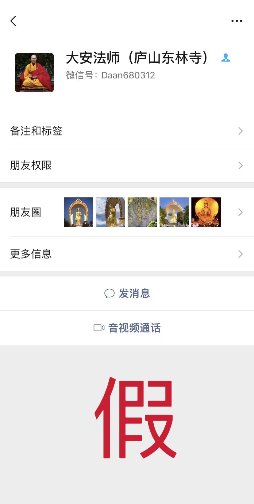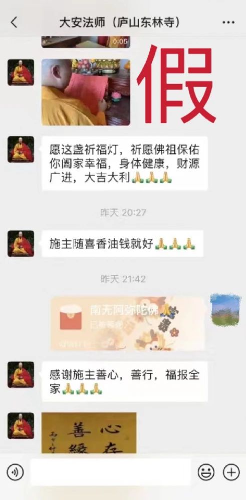接信众举报,近期网络上有冒用本寺方丈大安法师身份,在微信、微博等公共平台上与信众攀缘,以燃祈福灯等名义诱导信众捐善款,骗取信众钱财。