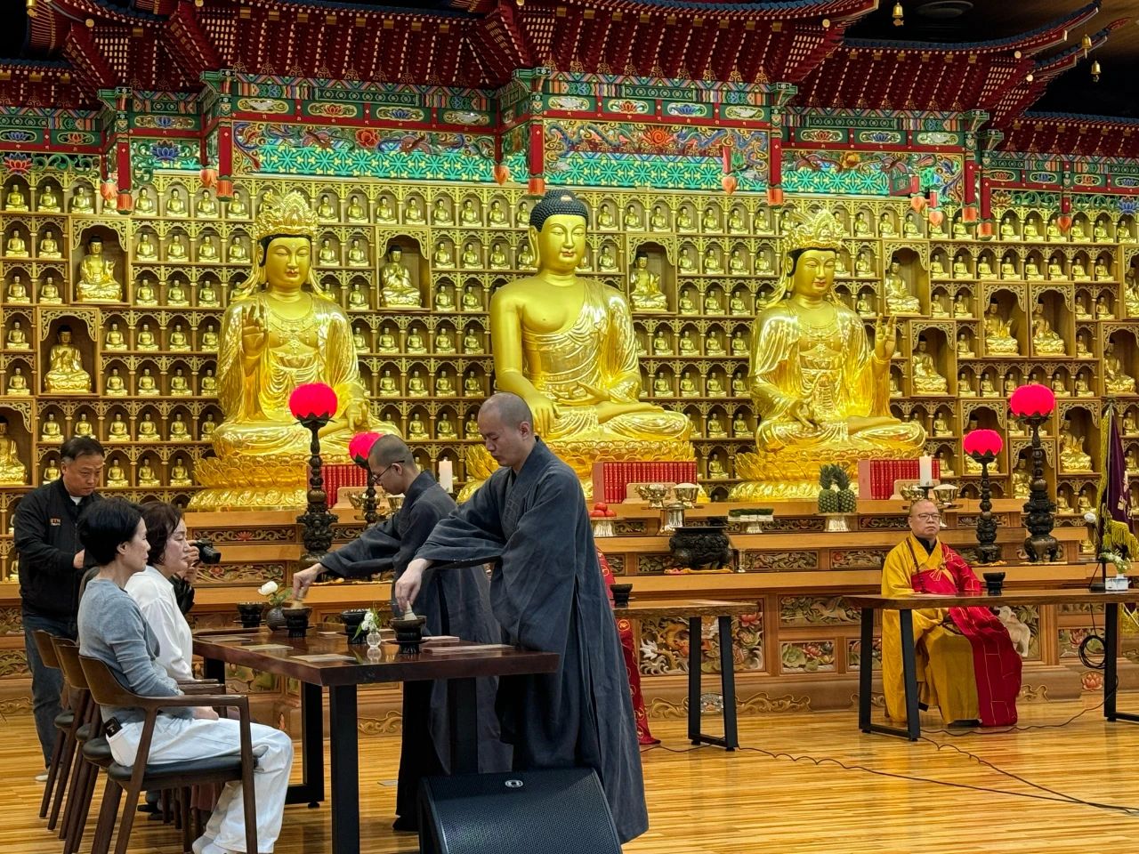 韩国天台宗大光寺5月8日,文化交流团在韩国大光寺止观堂,举行“径山茶宴”走出国门的首场展示,大光寺住持月张法师与寺院信众,并特别组织韩国茶人出席了此次茶宴。