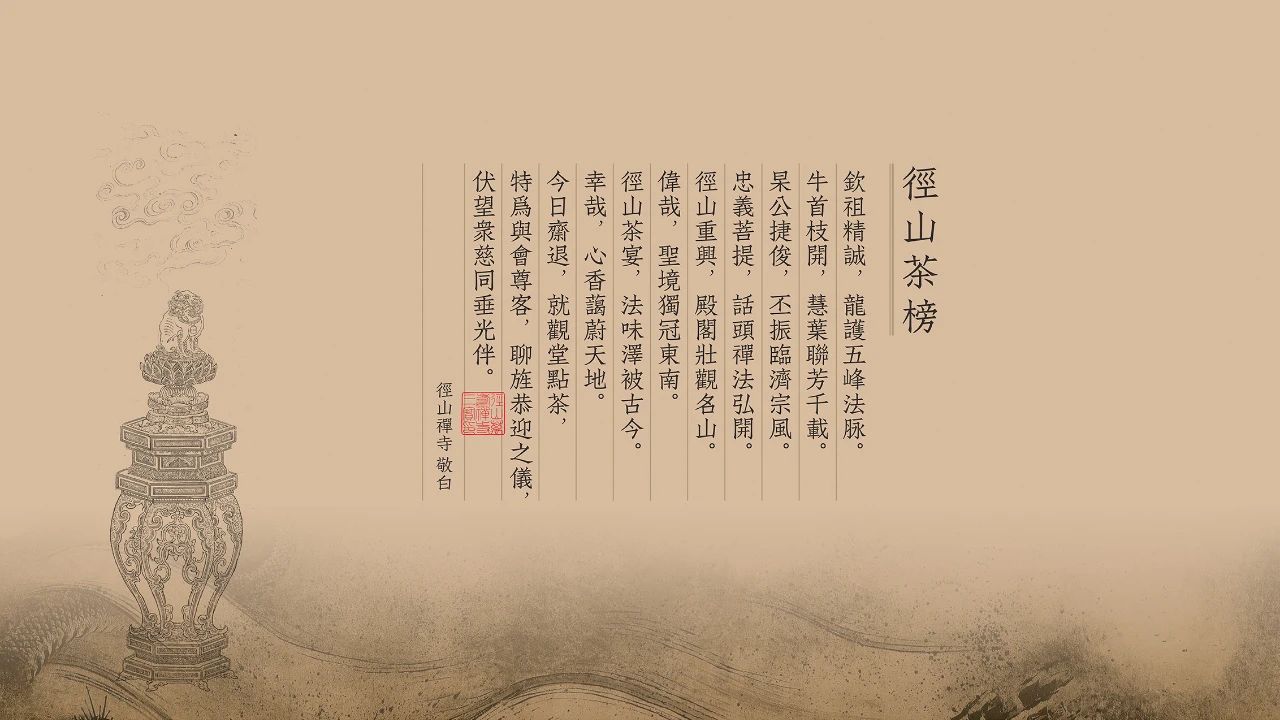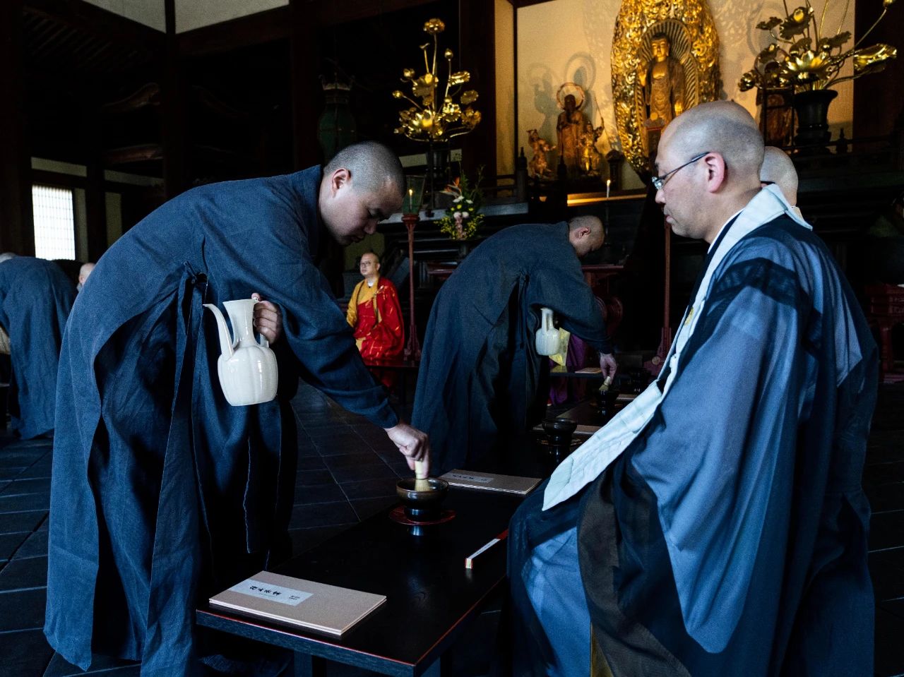 “径山茶宴”非遗专研班的十六位茶僧在庄严宝殿之中,为祖师、为尊客依序奉茶,在点一盏茶的谨严威仪中,在叉手站立、行步收盏中,体现着动静一如的禅境。一如之境涵容着道无南北、人无古今。这正是径山无准师范禅师所写下的:谁知千里同风事,历历分明在目今。