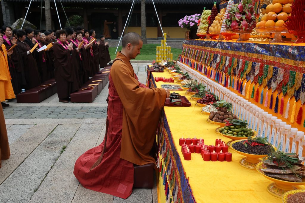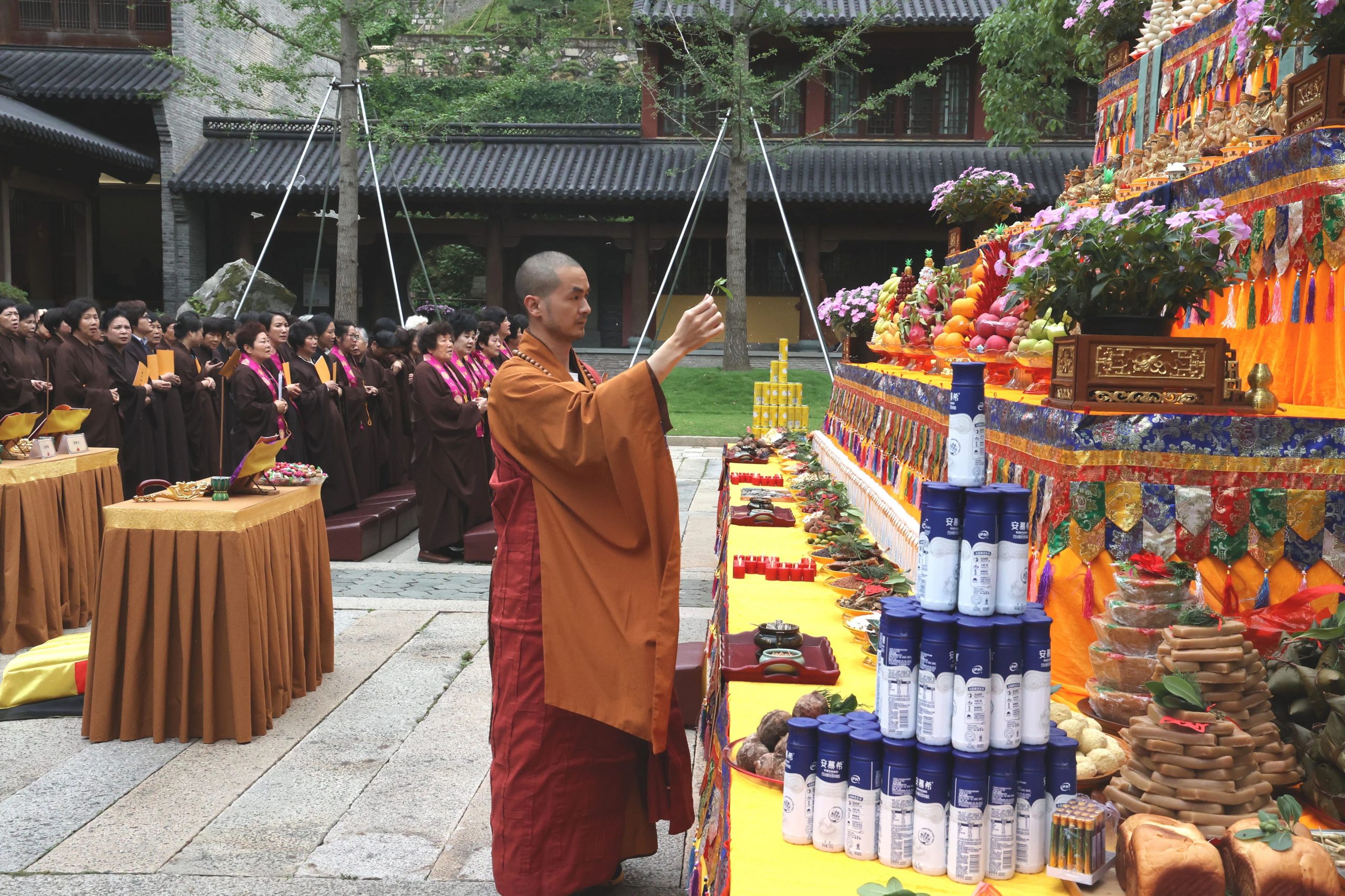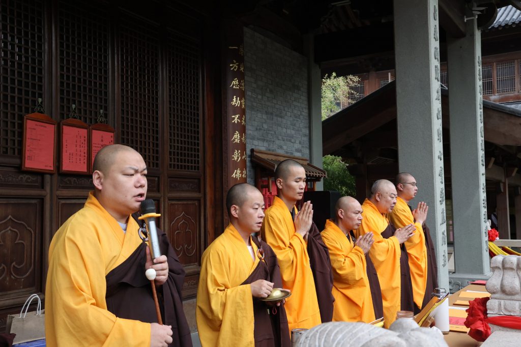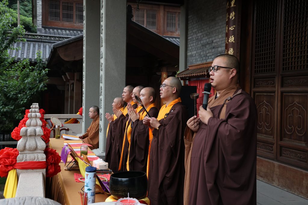 法会礼请头陀寺戒之法师主法,香花请、香花迎,主法法师引领大众净洒坛城,迎请十方诸佛降临坛场,护持法会。众法师云集大雄宝殿前,威仪严整,庄严肃穆。