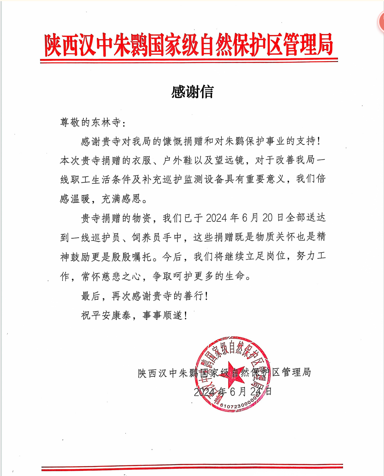图|陕西汉中朱環国家级自然保护区的感谢信