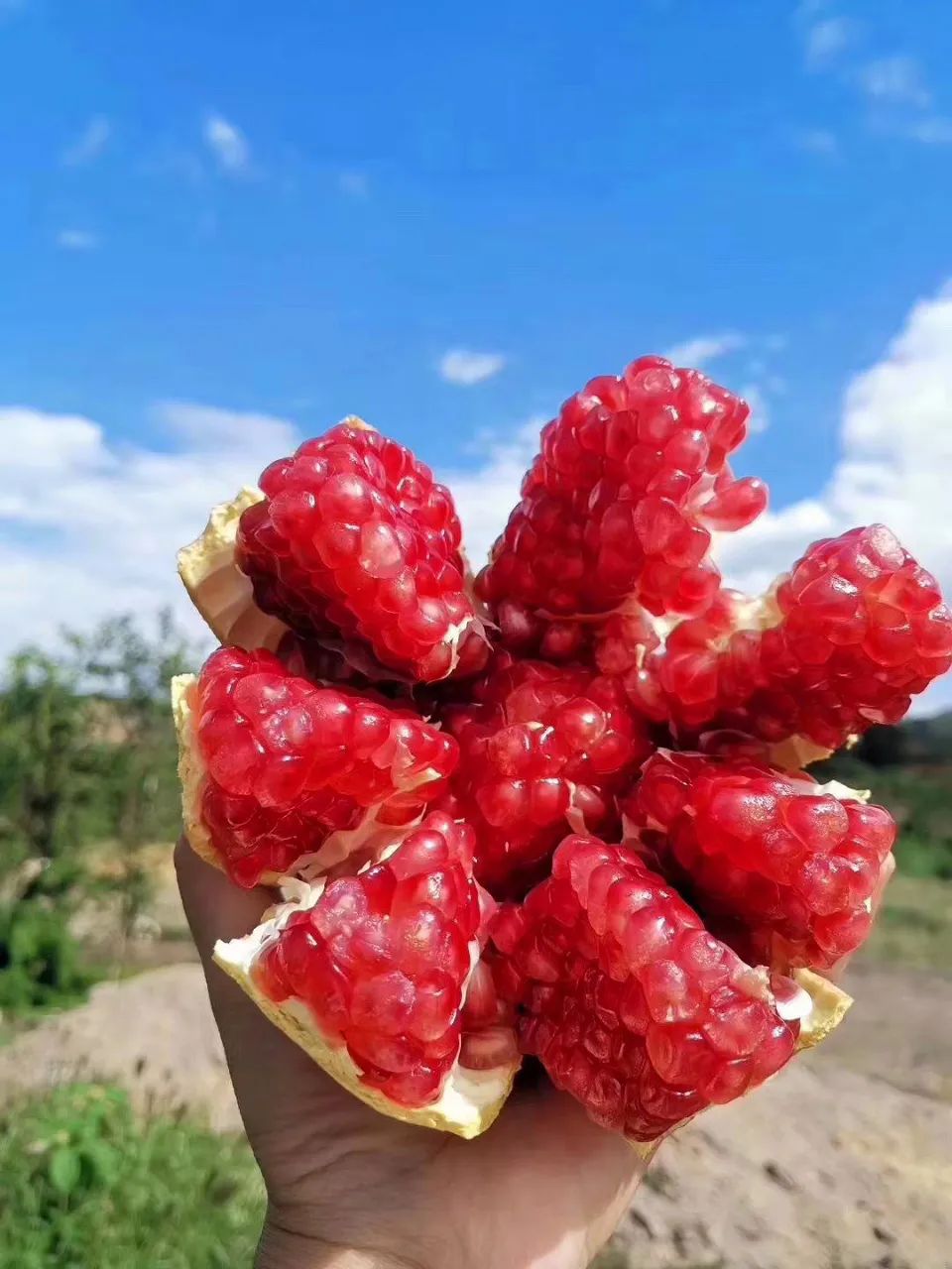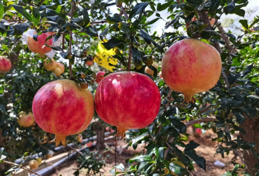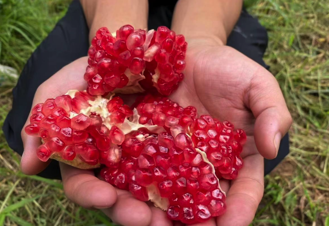 完全成熟时的石榴个头硕大,果皮光洁细腻,果大色香,果面鲜红,籽粒晶莹剔透,似玛瑙、赛珍珠,果味浓甜似蜂蜜。取一粒轻捏,会爆开甜蜜的小水库,吃的时候不需要吐籽,可以大口大口地吃,丝毫不影响口感,深受老人与小孩喜爱。