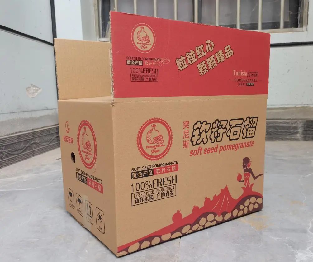 包装箱展示教你如何剥出花开般的石榴:在顶端划几刀掀开盖,再沿着角边由上往下划上几道,轻轻一掰就能露出颗粒饱满的果肉,每一颗都晶莹剔透,大口吃超爽!