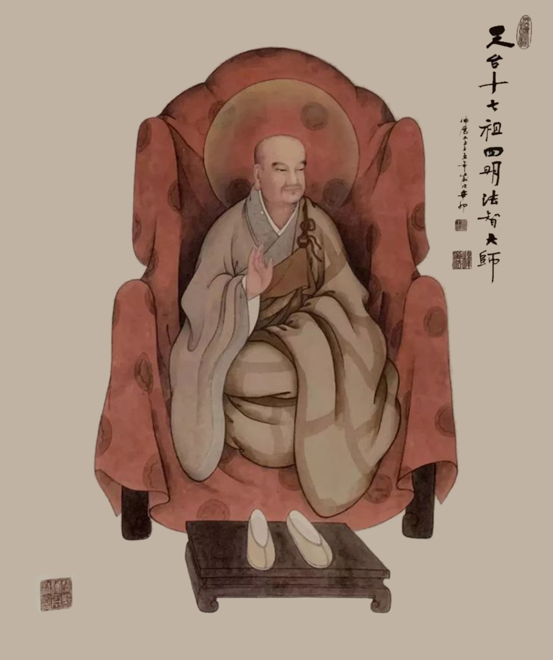四明知礼(960~1028),字约言,俗姓金,鄞州白塔巷人,刻版名工。宋真宗赐“法智大师”“四明尊者”,是为天台宗十七祖中兴大师。大师七岁依太平兴国寺洪选出家,十五岁受具足戒,探究律部要义,二十岁从天台螺溪传教院义通学天台教观,三年后即代师开讲说法,并任四明延庆寺住持。北宋淳化二年(991)受请住四明乾符寺,大开讲席,学徒云集。大师一生著作等身,在咸平六年(1003),日本源信禅师遣弟子寂照专程来四明请教天台宗教义,知礼撰《答日本国源信禅师二十七问》释疑。紧邻宁波火车站的祖关山文化公园及祖关路,就是为纪念大师而以大师之号命名的。