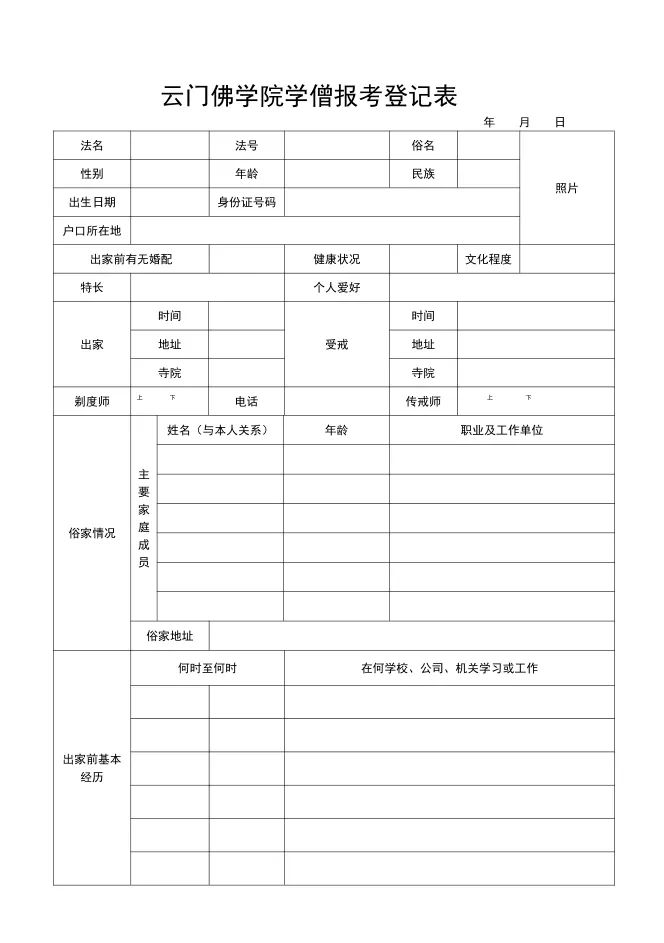 2、符合报考条件的僧人,见到招生简章后,认真填写报考登记表,并由本人所在寺院、佛协或剃度师签注意见。