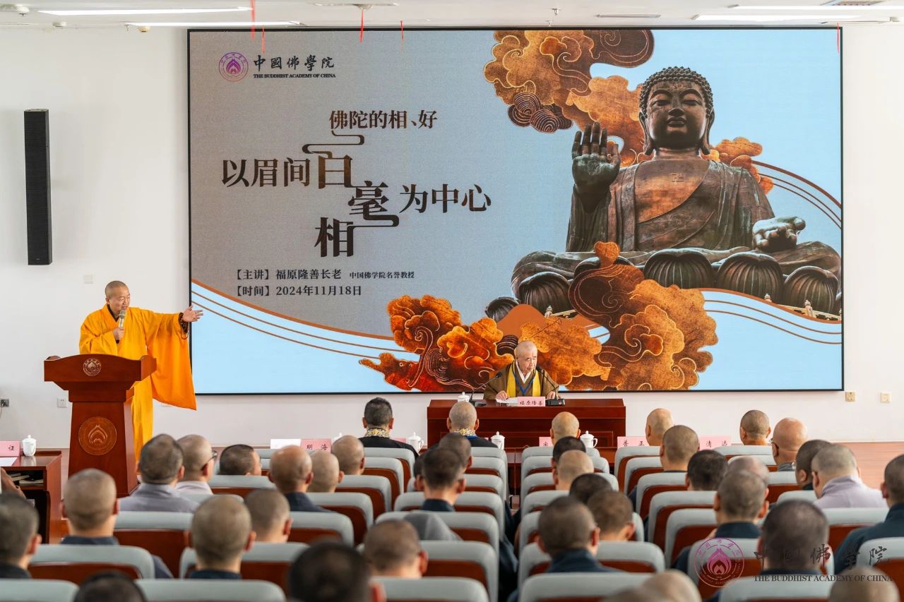 2024年11月18日,日中友好净土宗协会副总裁、日本大本山百万遍知恩寺法主福原隆善长老一行10人来访中国佛学院凤凰岭校区,并作专题讲座。中国佛教协会副会长宗性法师,中国佛教协会副会长、中国佛学院常务副院长明海法师,中国佛教协会副秘书长普正法师,中国佛学院副院长清远法师出席。我院各部室负责人及全体师生参加,讲座由常务副院长明海法师主持。