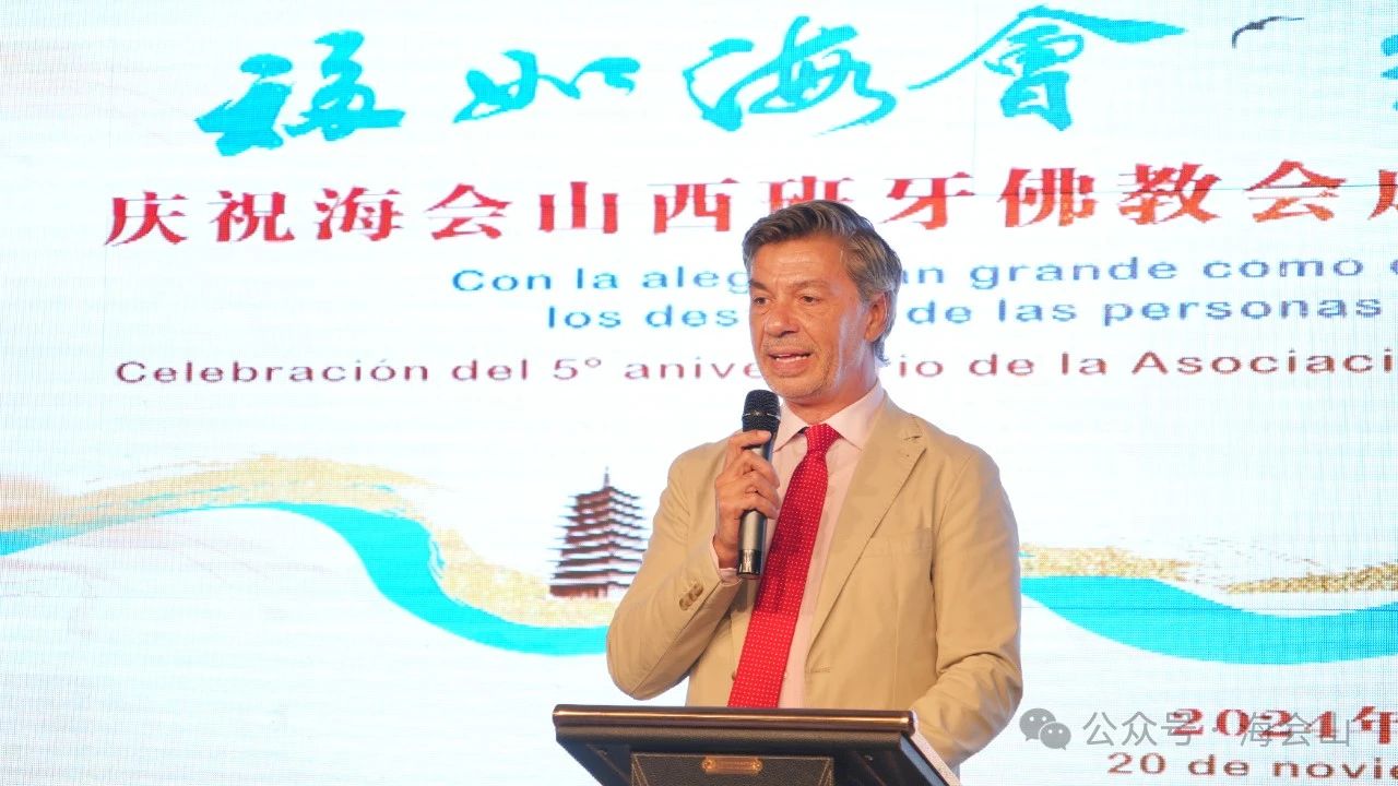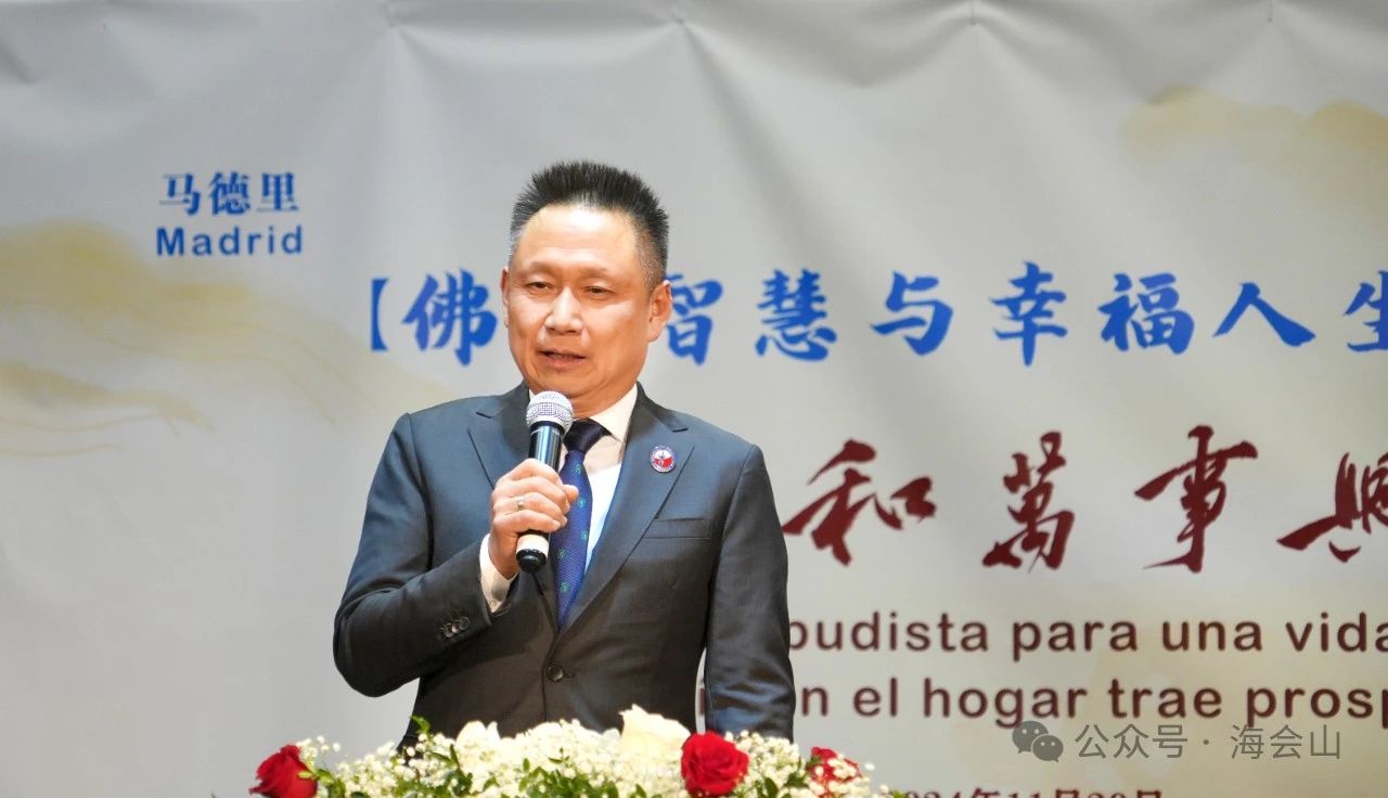 西班牙青田同乡会会长朱晓海先生在发言中强调了传播中国佛教文化对于增进西班牙人民对中华文化理解的重要性,并对海会山西班牙佛教会五年来取得的成就表示热烈祝贺,祝愿其在未来取得更加辉煌的成就,为中西文化交流作出更大贡献。