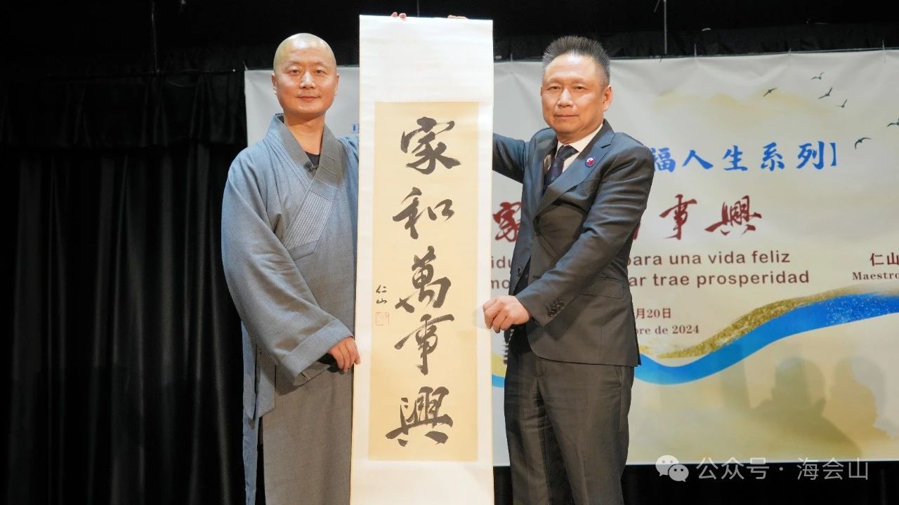 随后,仁山法师为与会嘉宾带来了题为“佛法智慧与幸福人生——家和万事兴”的精彩讲座。法师以其深厚的佛学修为,将深奥的佛法义理以通俗易懂的方式呈现给每一位听众,在轻松愉快的氛围中为大家带来深刻的智慧启迪。讲座在热烈的掌声中圆满结束,法师向致辞嘉宾赠送了纪念品,以表达对他们的诚挚感谢。