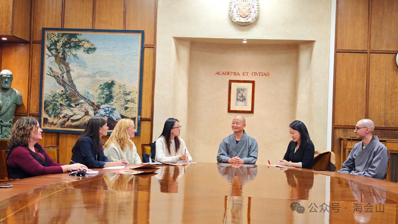 11月21日,法师一行造访了马德里阿尔卡拉(Alcalá)大学,受到了阿尔卡拉大学国际关系部负责人Pilar、文化交流部负责人Lorena、大学服务管理部负责人Silvia的热情接待。在交流中,法师与校方代表就教育与佛教之间的共通性展开了深刻而富有启发性的交流。教育致力于塑造全面发展的人才,助力学生顺利融入社会;而佛教则强调通过修行达到内心的平和,运用佛法的智慧消除内心的烦恼。两者之间的共通之处,不仅彰显了人类对美好生活的普遍向往,也为双方提供了宝贵的学习和融合的机会。