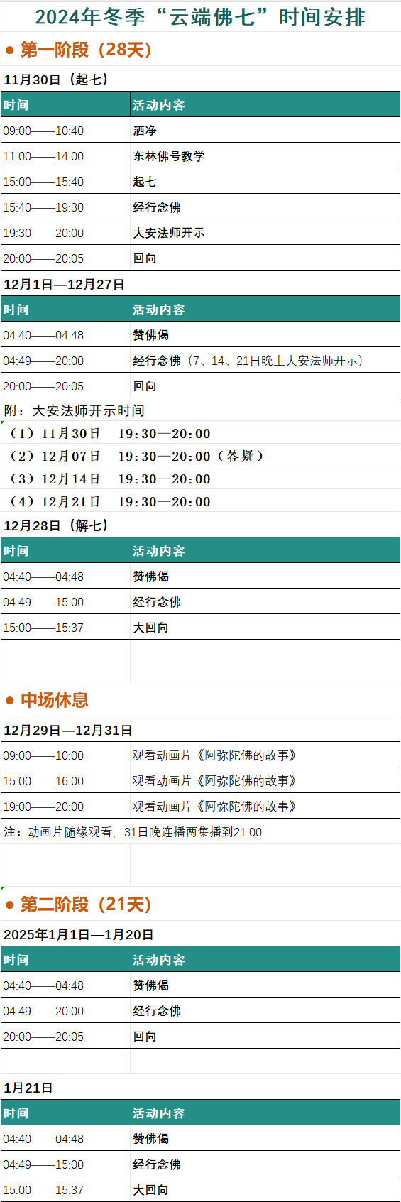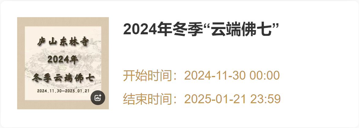 “观万法如梦,唯一心念佛,若欲众生离苦海,一句弥陀作大舟”,庐山东林寺祖庭与净土苑,定于甲辰(2024年)冬腊两月,依例启建冬季49日佛七,专持六字洪名,用作往生资粮。七七为期,六时无间,为利乐远程莲友,特开“云端”念佛之方便,俾四方善友同一心念,九界众生共蒙佛恩。