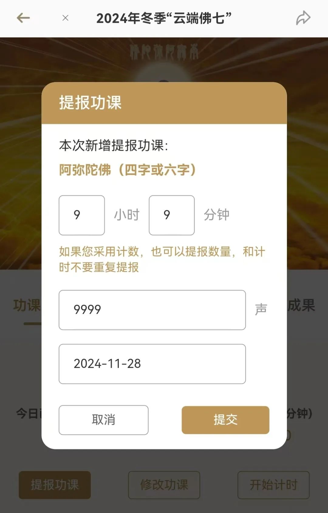 点击“开始计时”,即可开始记录共修时长。如需暂停,请先点击提报功课,手动输入参与念佛共修的时长。如果您是计数念佛,就填写念佛数量。注意不要重复填写。