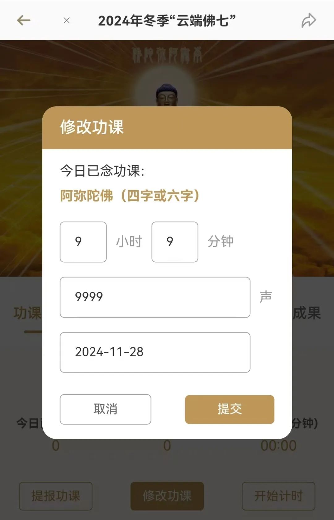 您可以多次提报功课数量,当天功课总数会累加。如果提报错误,点击“修改功课”,即可修改。