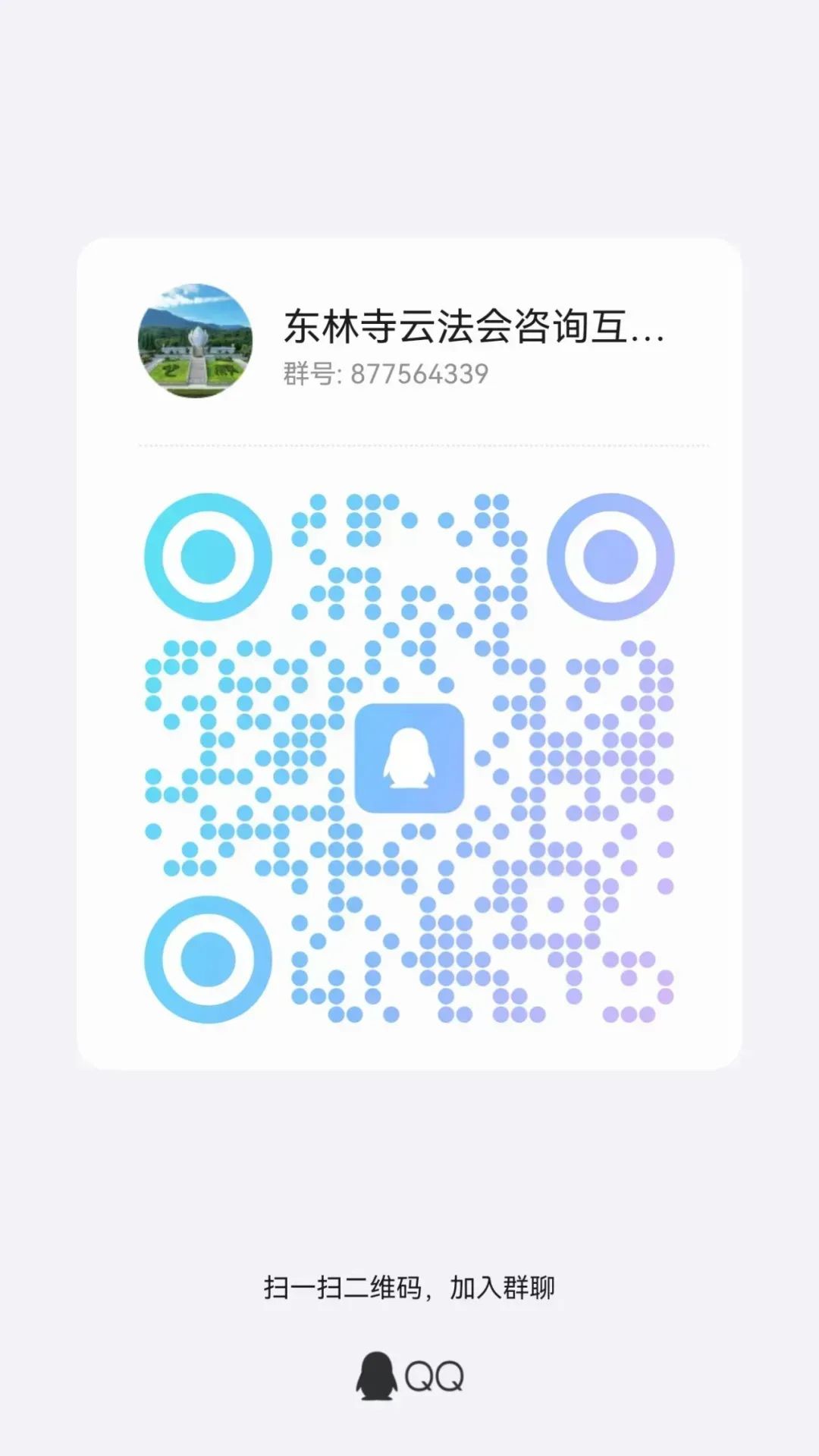 为了便于信众咨询,本次云端佛七我们建了一个QQ群“东林寺云法会咨询互动群”,有需要的莲友可扫码申请入群。
