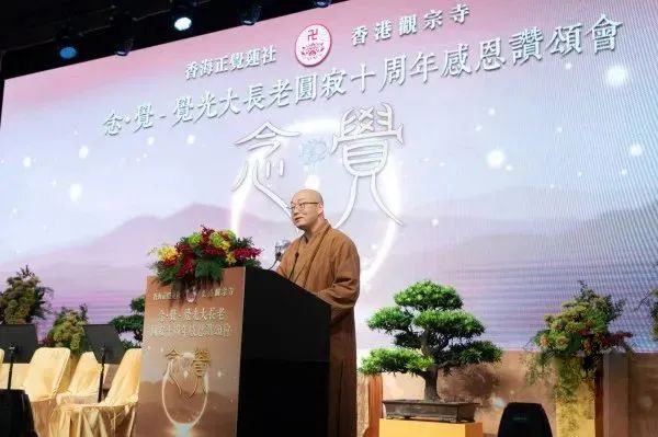 赞颂会主席、香海正觉莲社社长、香港观宗寺方丈、觉光长老法嗣宏明法师在致辞中说,赞颂会的目的不是为了让大家赞颂长老,记得长老,而是为了让更多的人更好的继承他普度众生的宏愿,发扬他爱国爱教的精神,学习他的无私无畏,将佛教慈悲大爱与正念智慧传递给更多的社会大众。我们要以老和尚为榜样,不断提升自己的修为,成为有坚定信仰、有家国情怀、悲智圆融,担当奉献的人,共同为和谐美好的未来而努力。这是纪念老和尚和对老和尚最好的感恩和报恩。