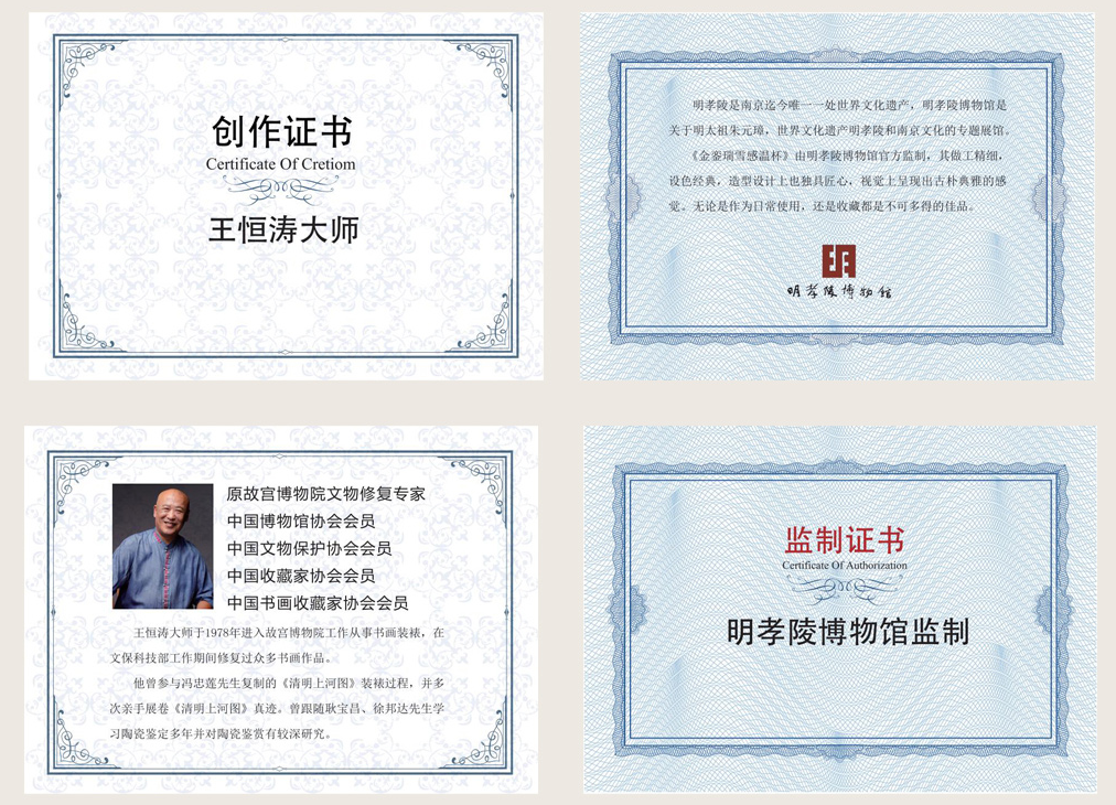 每套《金銮瑞雪》感温变色杯都配有创作证书和监制证书,官方权威,为您保驾护航!