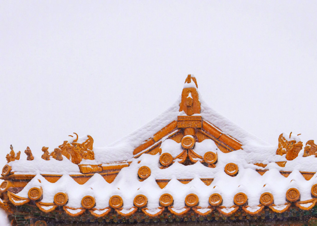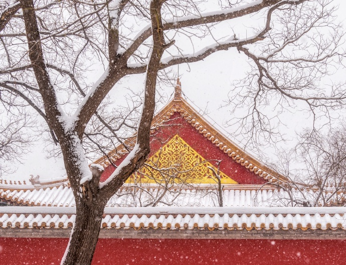 那是碎玉散朱城,兽首共白头的浪漫,六百年岁月的雍容与悠远。“宫城团回凛严光,白天碎碎堕琼芳。”雪落成诗最美莫过于金色琉璃瓦上,那一点皓白如玉。
