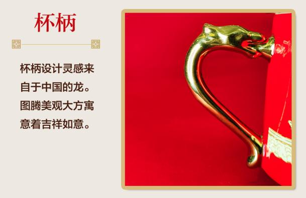 杯柄设计灵感来自于中国的图腾——龙。美观大方,寓意着吉祥如意。龙在中国传统文化中象征着吉祥、尊贵和力量。杯柄以龙的造型呈现,象征着文化的传承。