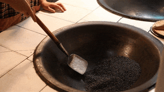 然后放入芝麻、枸杞、核桃仁一起大火快速翻炒,炒到用手轻轻一捻,芝麻的肉在手心里爆开,噼噼啪啪。