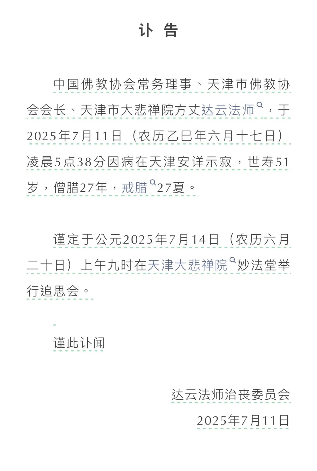 据讣告显示,达云法师追思会将于2025年7月14日(农历六月二十日)上午九时在天津大悲禅院妙法堂举行。
