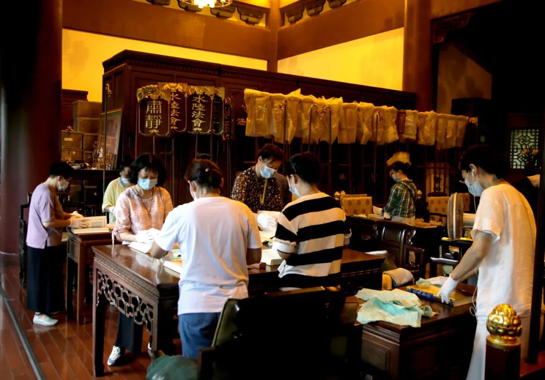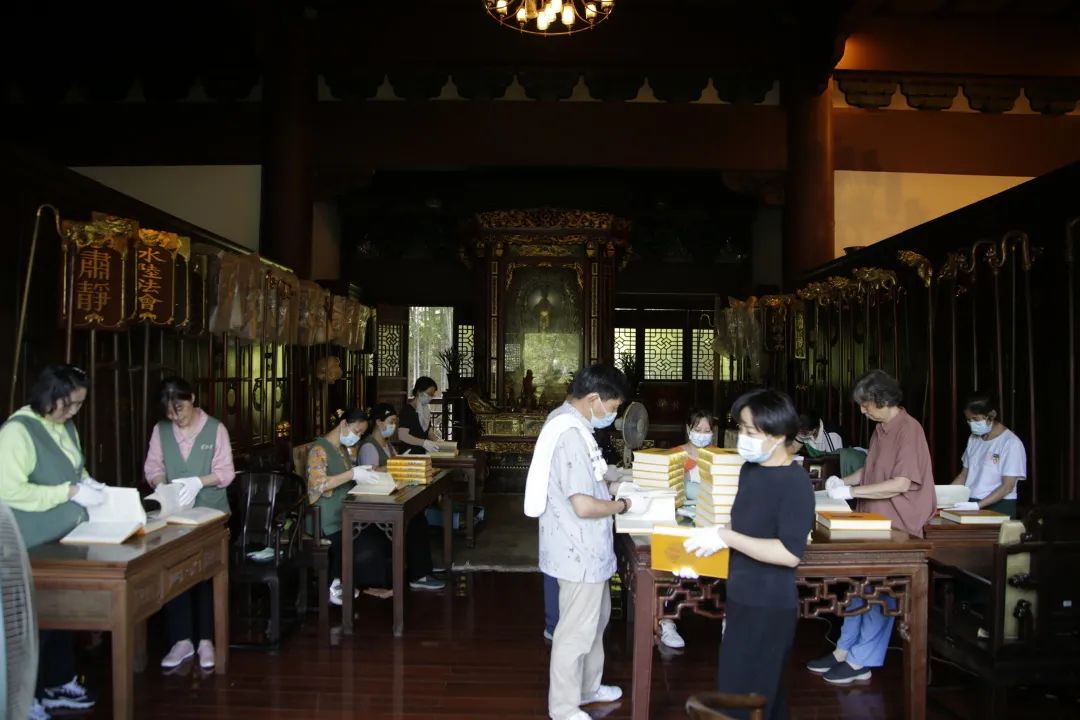 夏季天气闷热,又值梅雨季刚过,气候湿润,万物极易霉腐损坏。寺院珍藏之佛经,长年存放于“藏经楼”,易发霉生蠹。每年农历六月梅雨季过后,灵隐寺常住法师会组织云林志工翻晒经书。