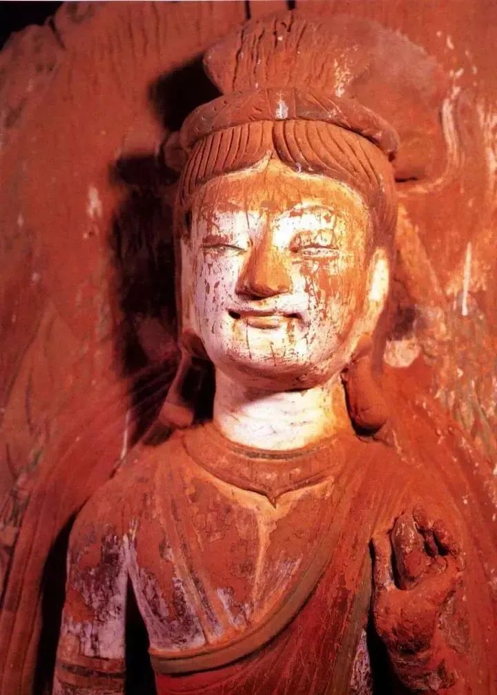 眼睛细长,眉毛细弯,脸形浑圆,没有了犍陀罗雕塑那种雅利安民族鲜明的棱角,这与凉州保持悠久的中原文化传统有关。除了垂肩的双耳之外,很难找出“三十二相好”的佛像标准。