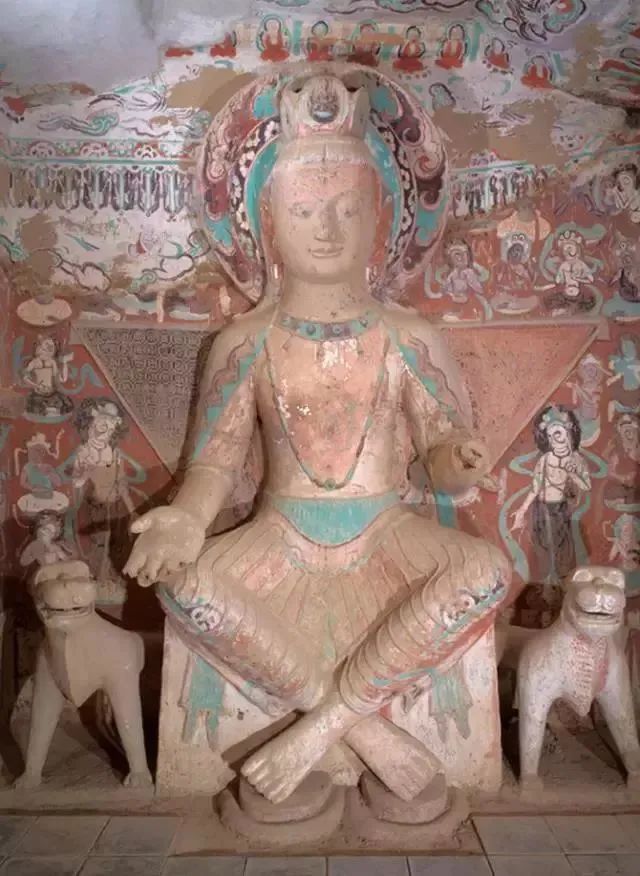 同窟北壁上层西侧的弥勒菩萨,面部造型丰圆淳厚。用今天的眼光看,菩萨的精神气质的表现和外部造型的塑造,都有明显提高。五官的造型,目光的视角,以及脸型和色彩,都带有鲜明的“凉州模式”的痕迹,但显然已经开始具有自己独立的风格。