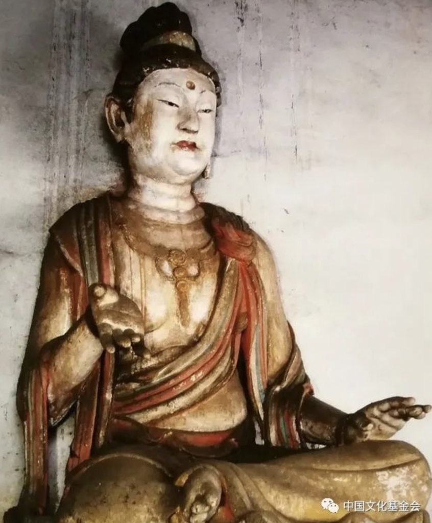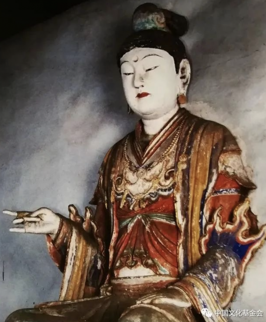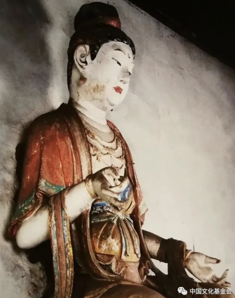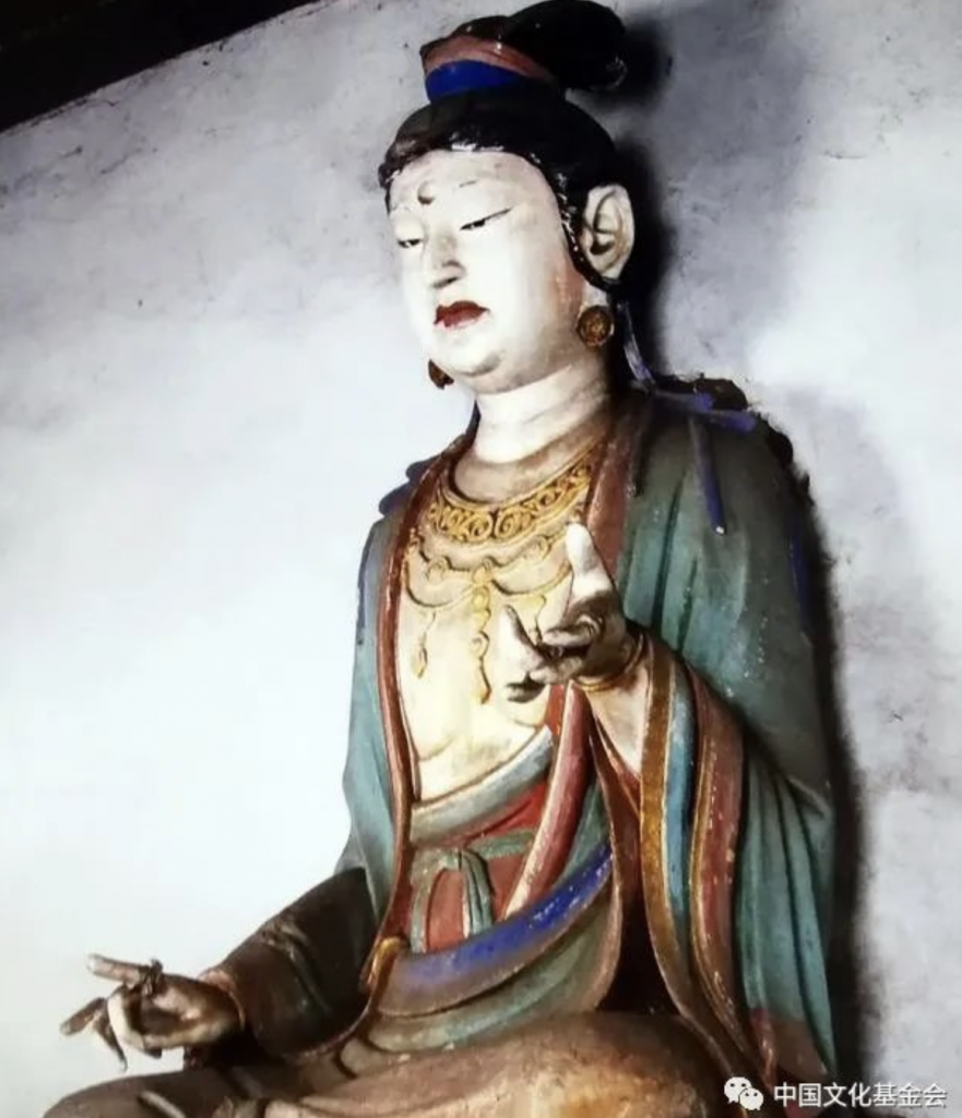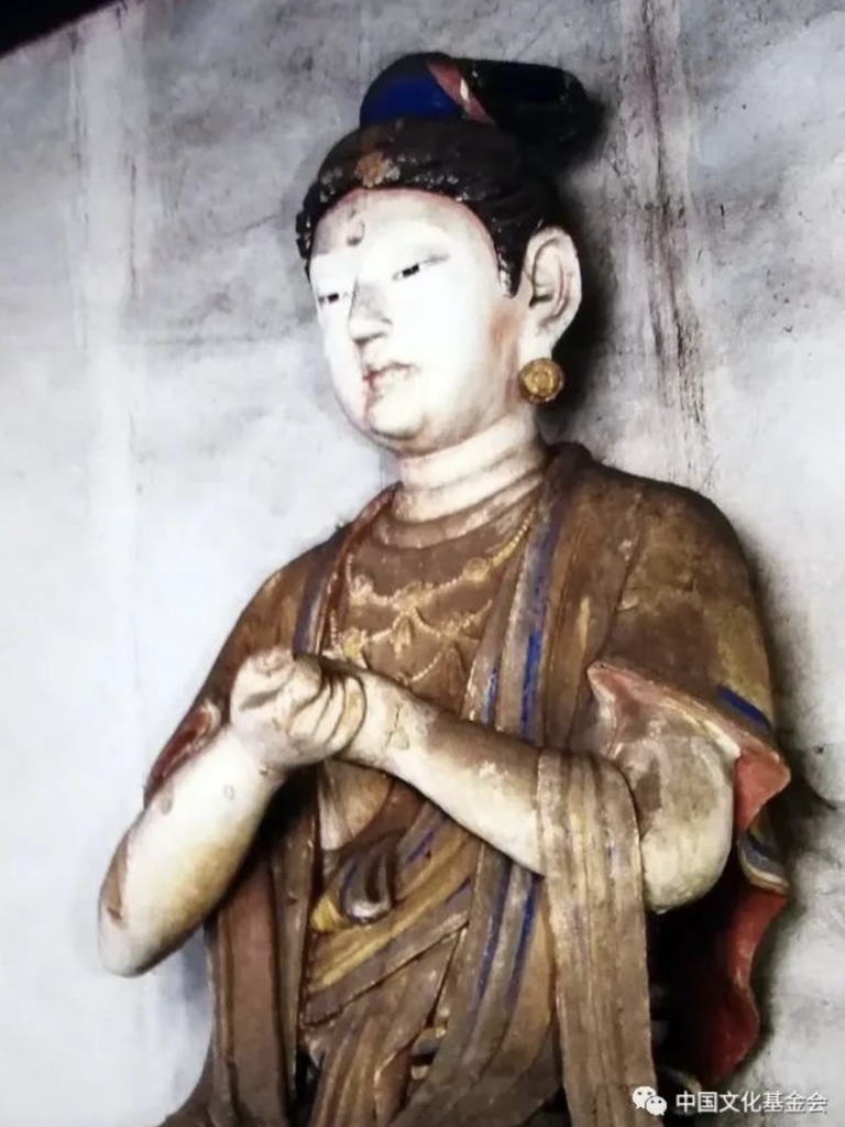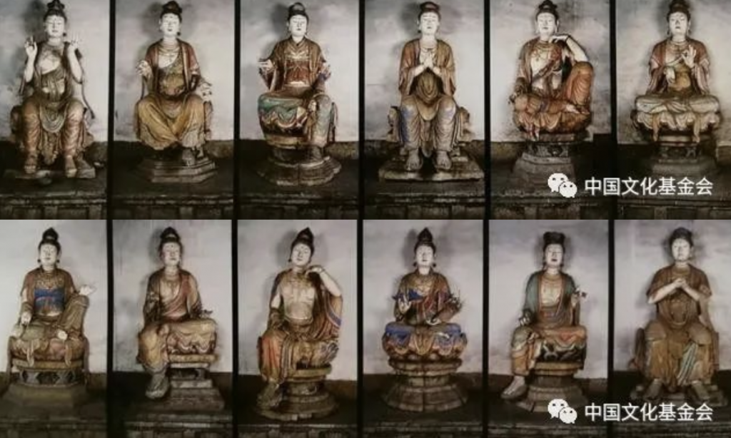 两边靠墙塑着12尊圆觉像,或裸露上身,或披衣帛,面庞圆润,高髻秀眉,神态庄重俊逸,服饰色彩柔和,衣纹起伏流畅富有韵律感。特别是一手托腮作思考状的圆觉像,神情溢于眉梢,流于眼角,造型优美逼真。