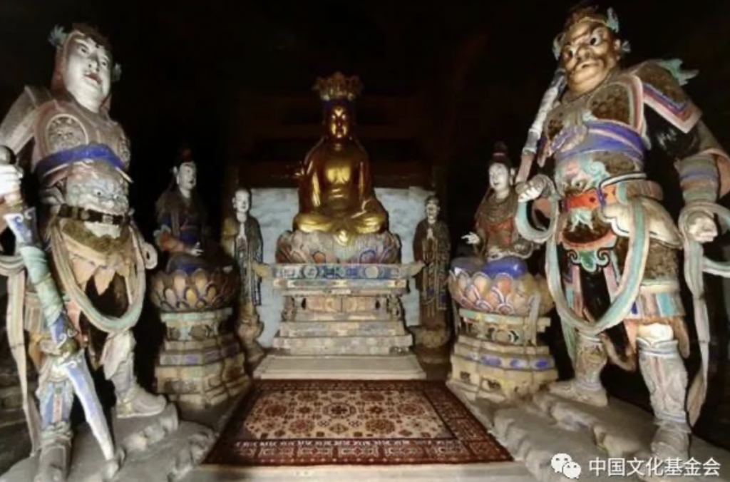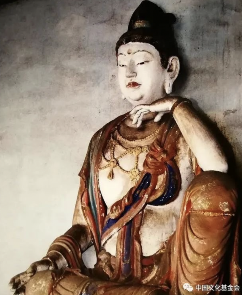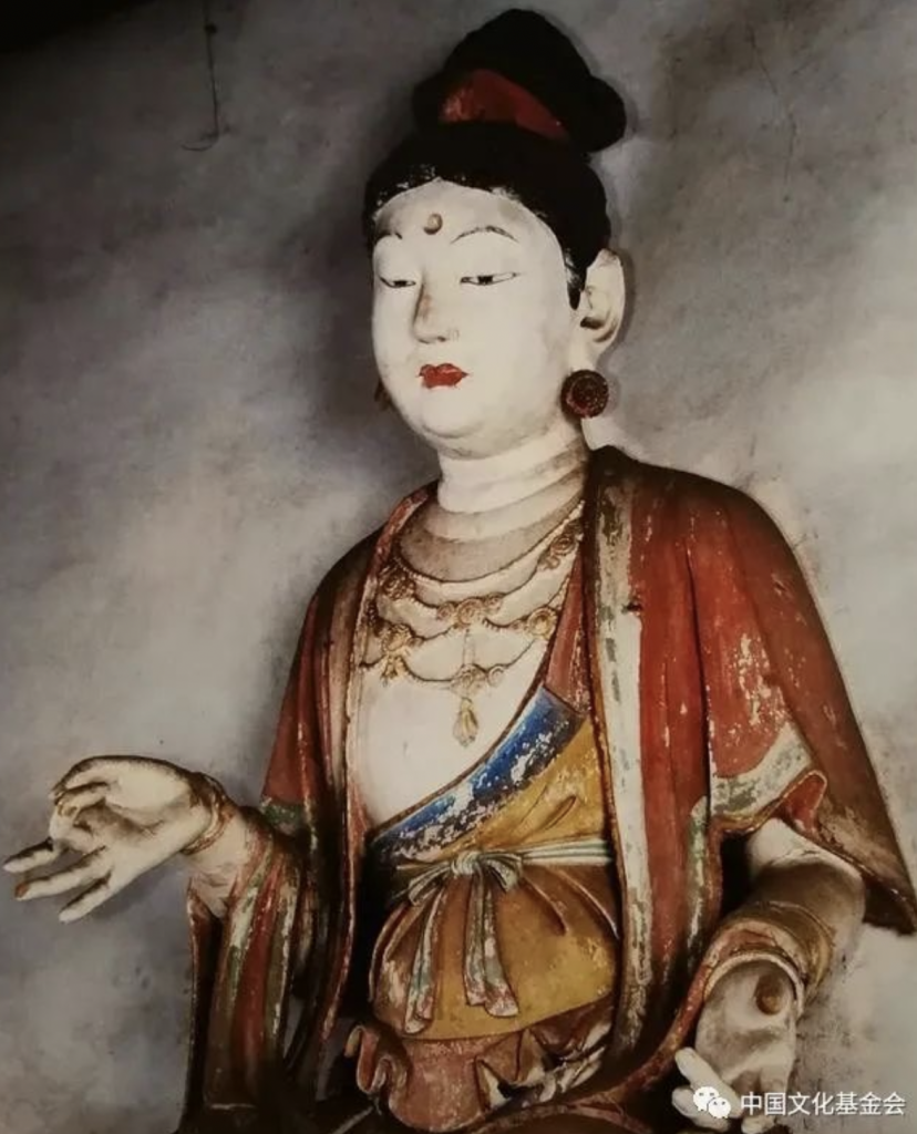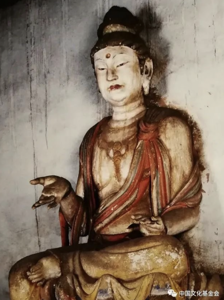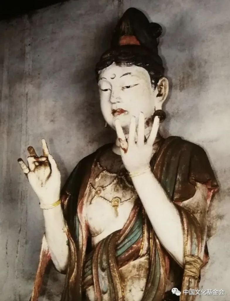 两边靠墙塑着12尊圆觉像,或裸露上身,或披衣帛,面庞圆润,高髻秀眉,神态庄重俊逸,服饰色彩柔和,衣纹起伏流畅富有韵律感。特别是一手托腮作思考状的圆觉像,神情溢于眉梢,流于眼角,造型优美逼真。