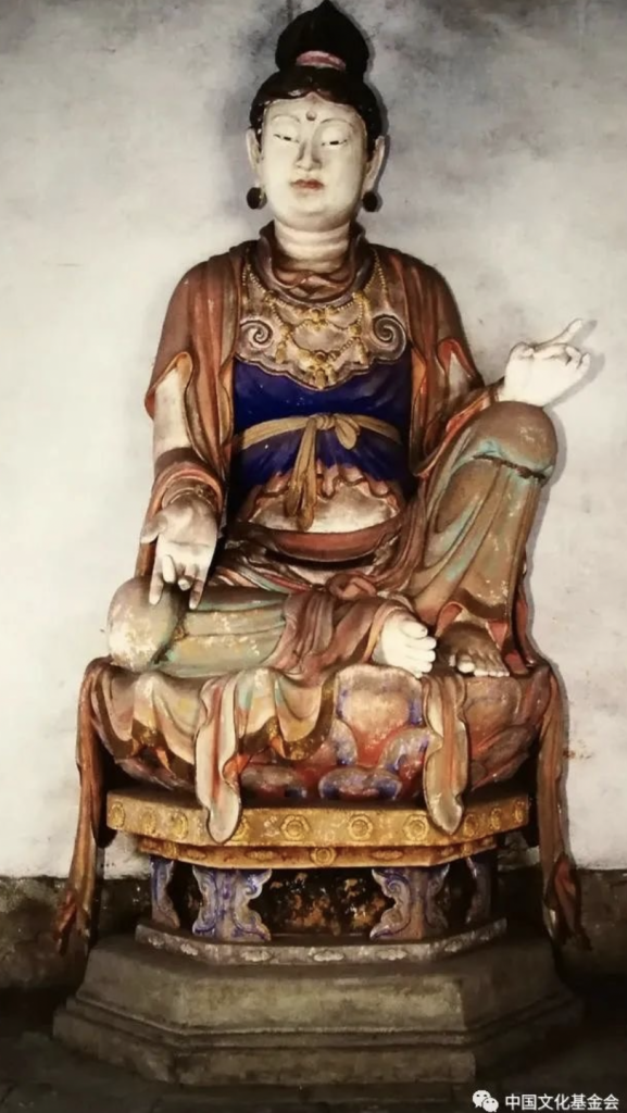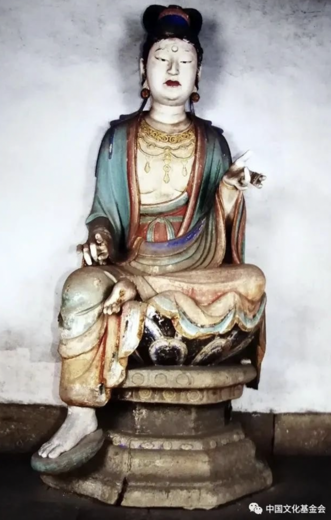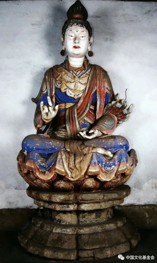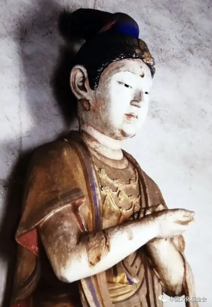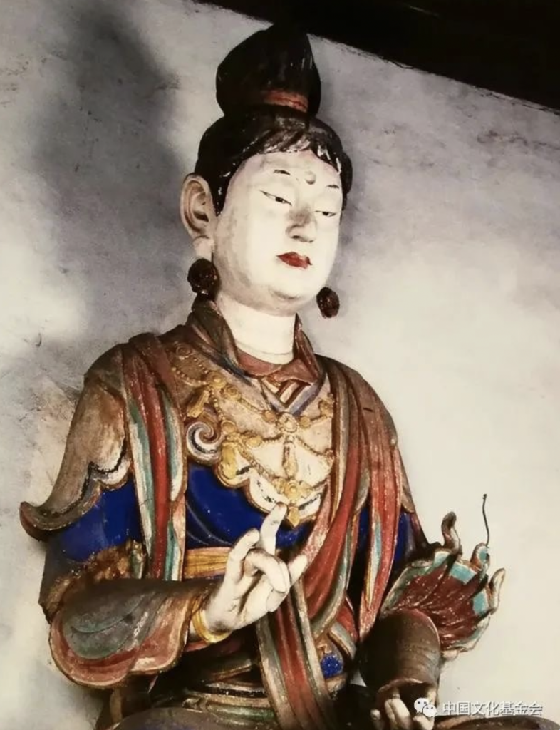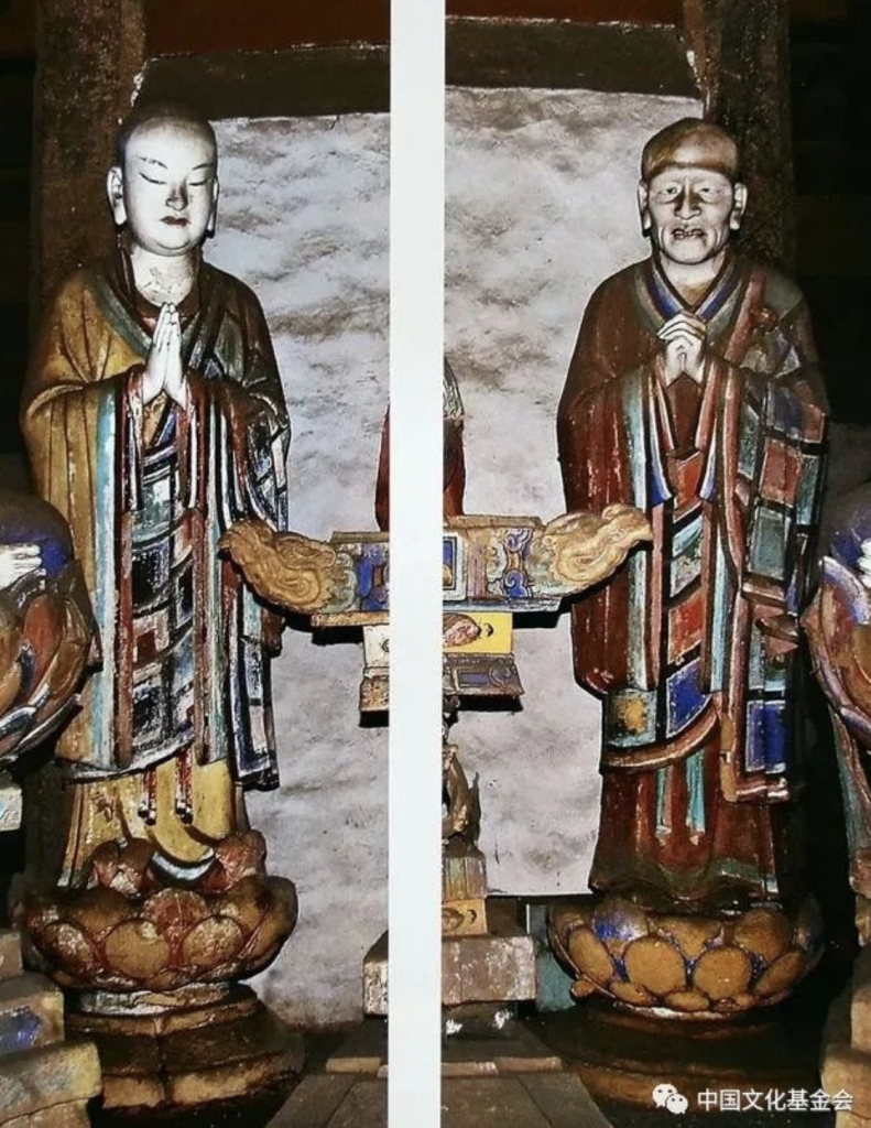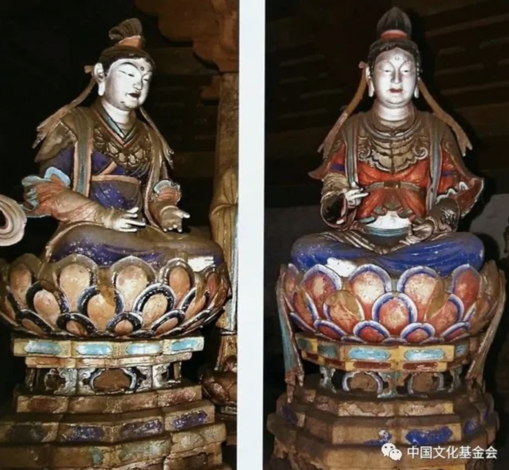 佛祖两侧胁侍的文殊和普贤两尊菩萨,端坐莲台之上,矜持典丽,亦具各性,但据碑记及实证,此二像均在后代大修时已“伤筋动骨”。对比未经大修的十二大菩萨,高下顿显。