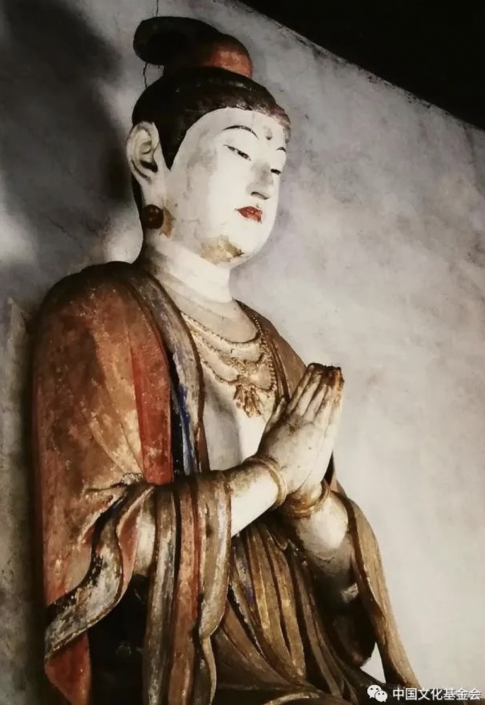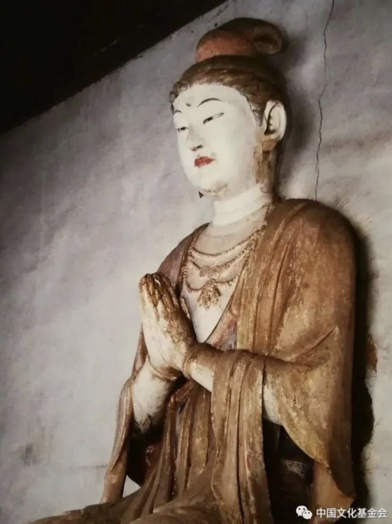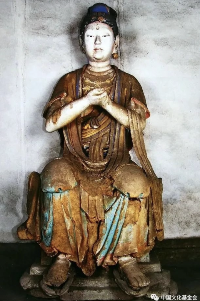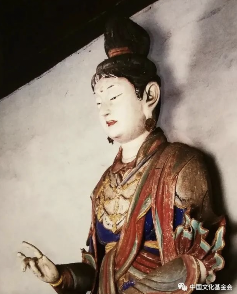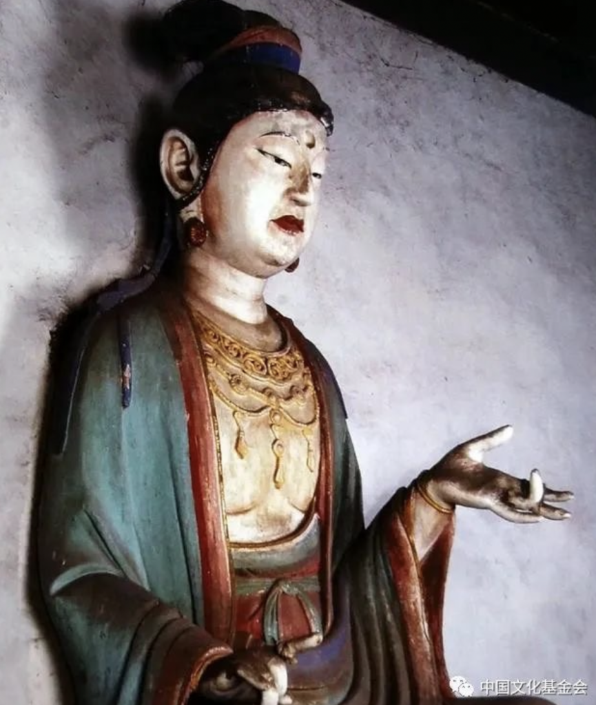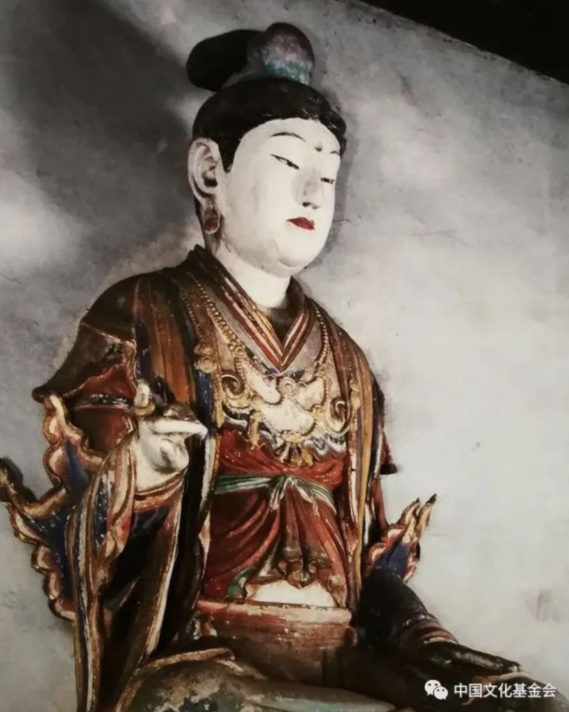 佛祖两侧胁侍的文殊和普贤两尊菩萨,端坐莲台之上,矜持典丽,亦具各性,但据碑记及实证,此二像均在后代大修时已“伤筋动骨”。对比未经大修的十二大菩萨,高下顿显。