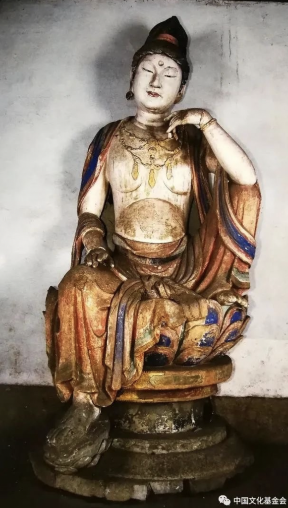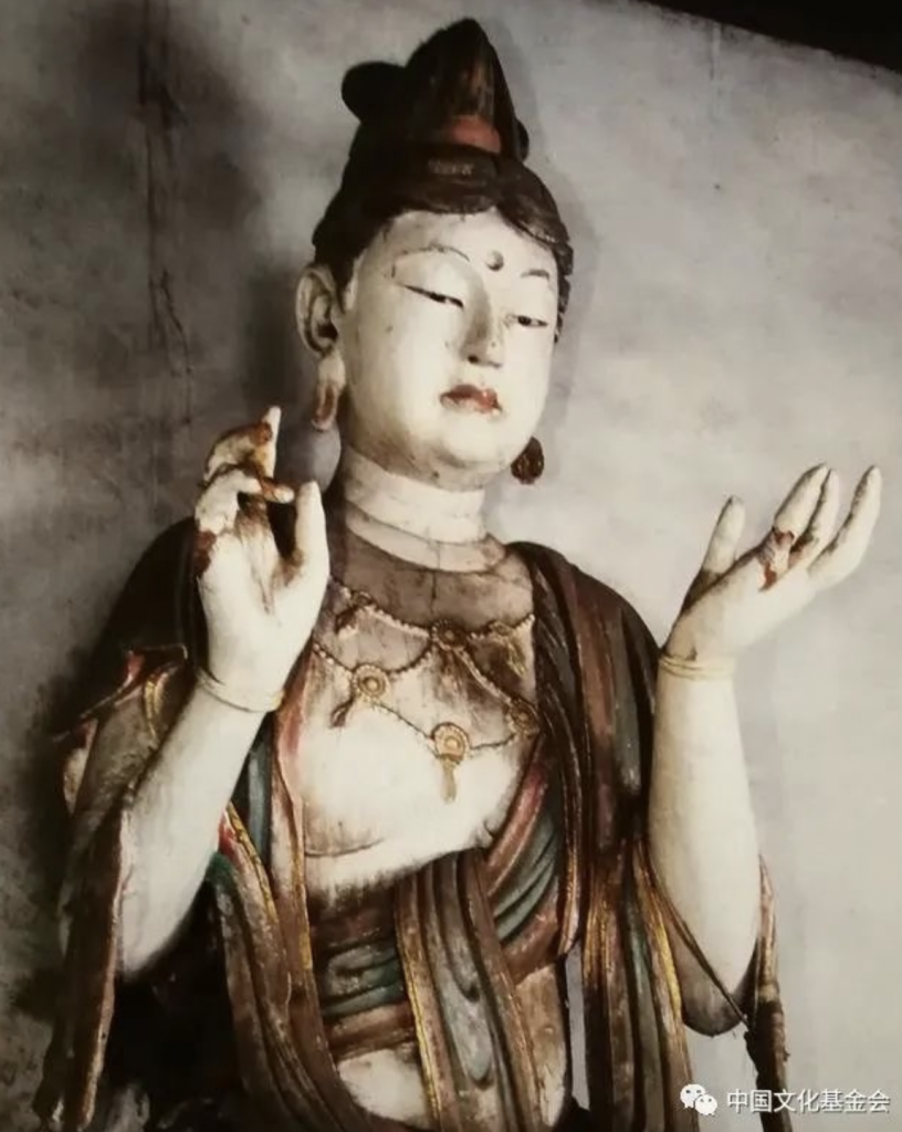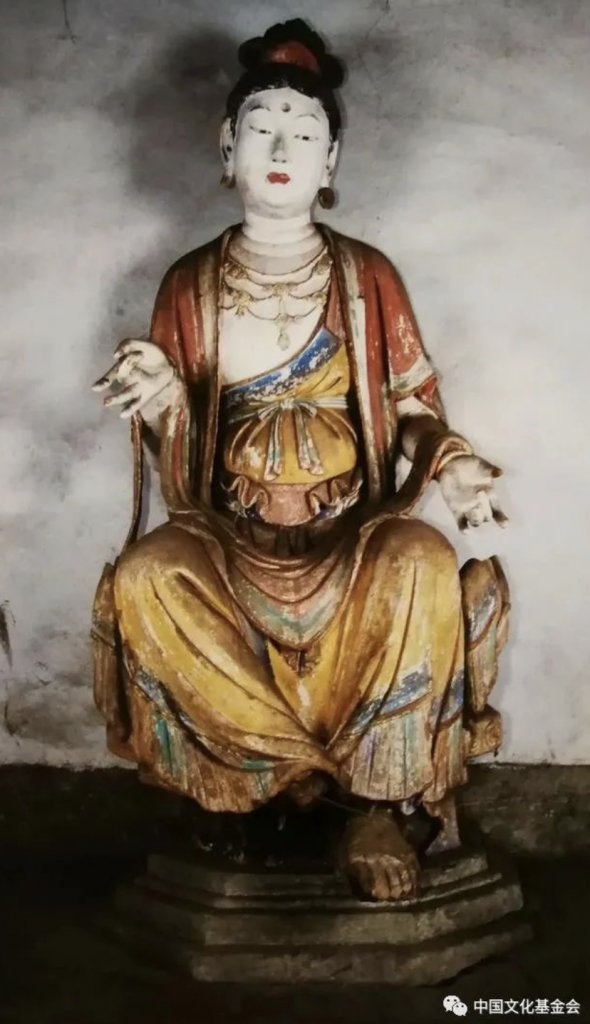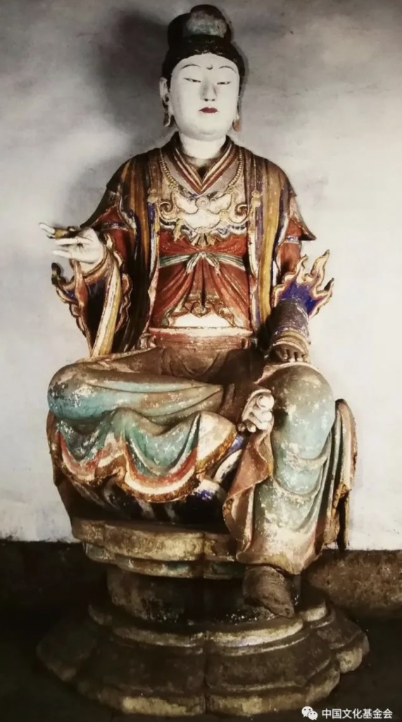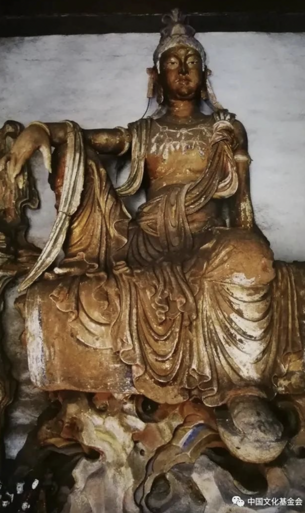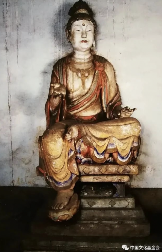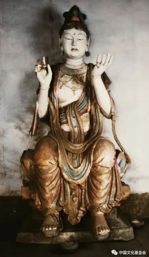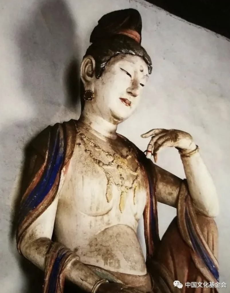 佛祖两侧胁侍的文殊和普贤两尊菩萨,端坐莲台之上,矜持典丽,亦具各性,但据碑记及实证,此二像均在后代大修时已“伤筋动骨”。对比未经大修的十二大菩萨,高下顿显。